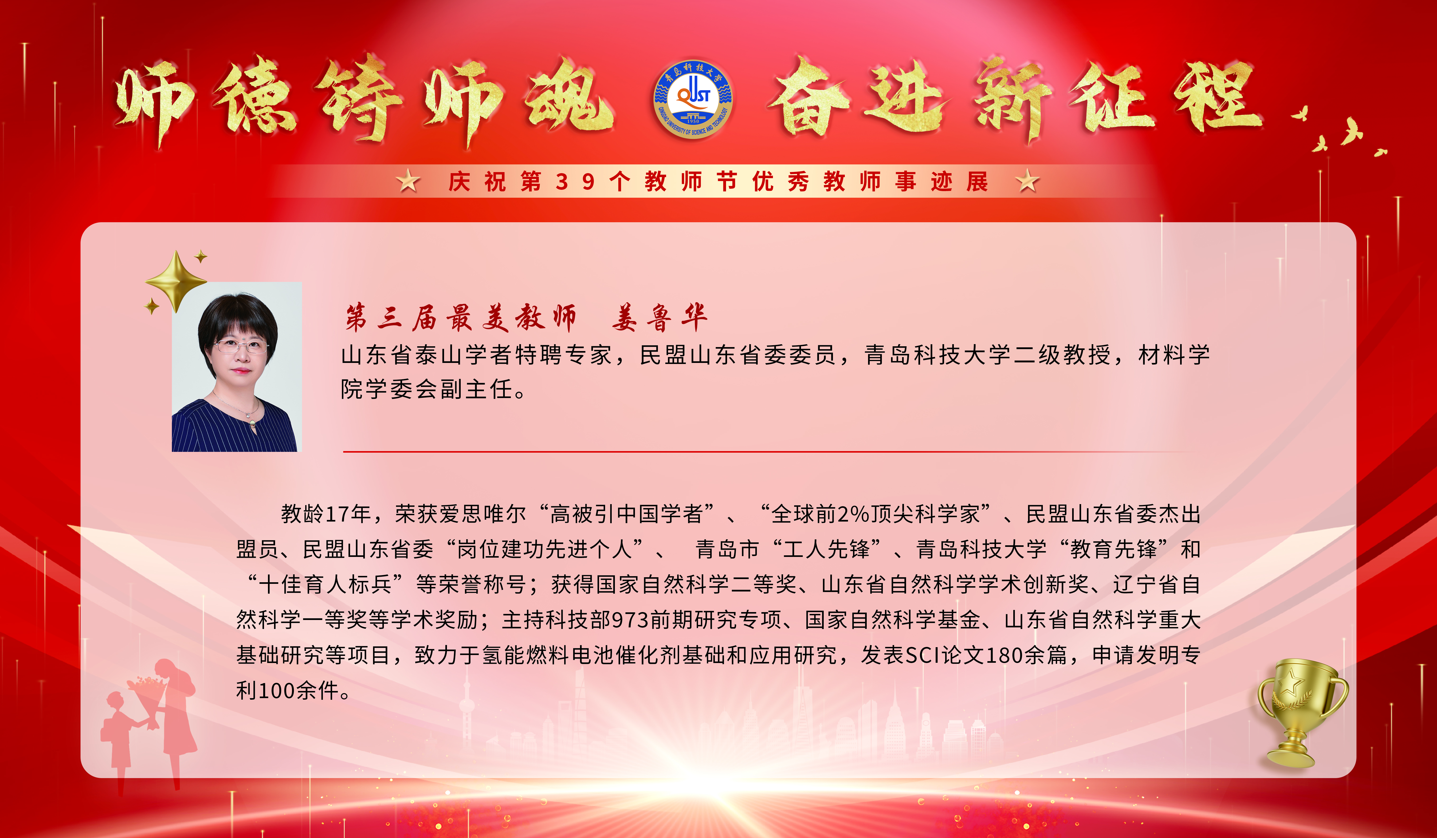 姜鲁华,女,山东省泰山学者特聘专家、民盟山东省委委员、青岛市政协委员,兼任民盟KY开元集团官网基层委员会副主委。1996年 9月参加工作,教龄 17年,现任KY开元集团官网二级教授,材料学院学术委员会副主任。获得的主要荣誉称号有:爱思唯尔“高被引中国学者”、全球前2%顶尖科学家、民盟山东省委杰出盟员、民盟山东省委“岗位建功先进个人”、山东省教书育人楷模、青岛市“工人先锋”、KY开元集团官网“教育先锋”和“十佳育人标兵...