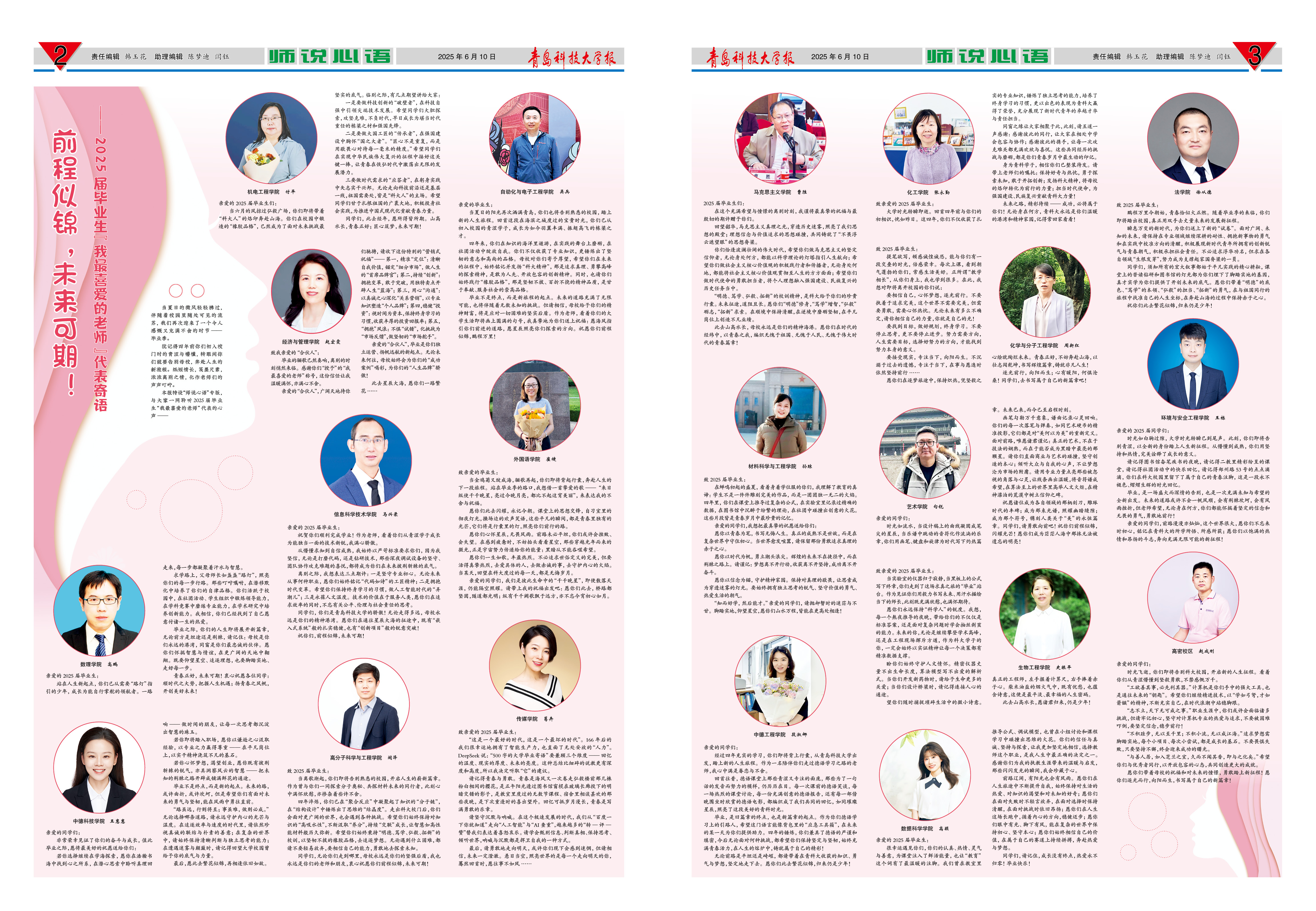 机电工程学院 付平亲爱的2025届毕业生们:当六月的风掠过弘毅广场,你们即将带着“科大人”的烙印奔赴山海。你们在校园中锻造的“橡胶品格”,已然成为了面对未来挑战最坚实的底气。临别之际,有几点期望讲给大家:一是要做科技创新的“破壁者”,在科技自强中引领尖端技术发展。希望同学们大胆探索,攻坚克难,不负时代,早日成长为堪当时代重任的栋梁之才和强国先锋。二是要做大国工匠的“传承者”,在强国建设中胸怀“国之大...