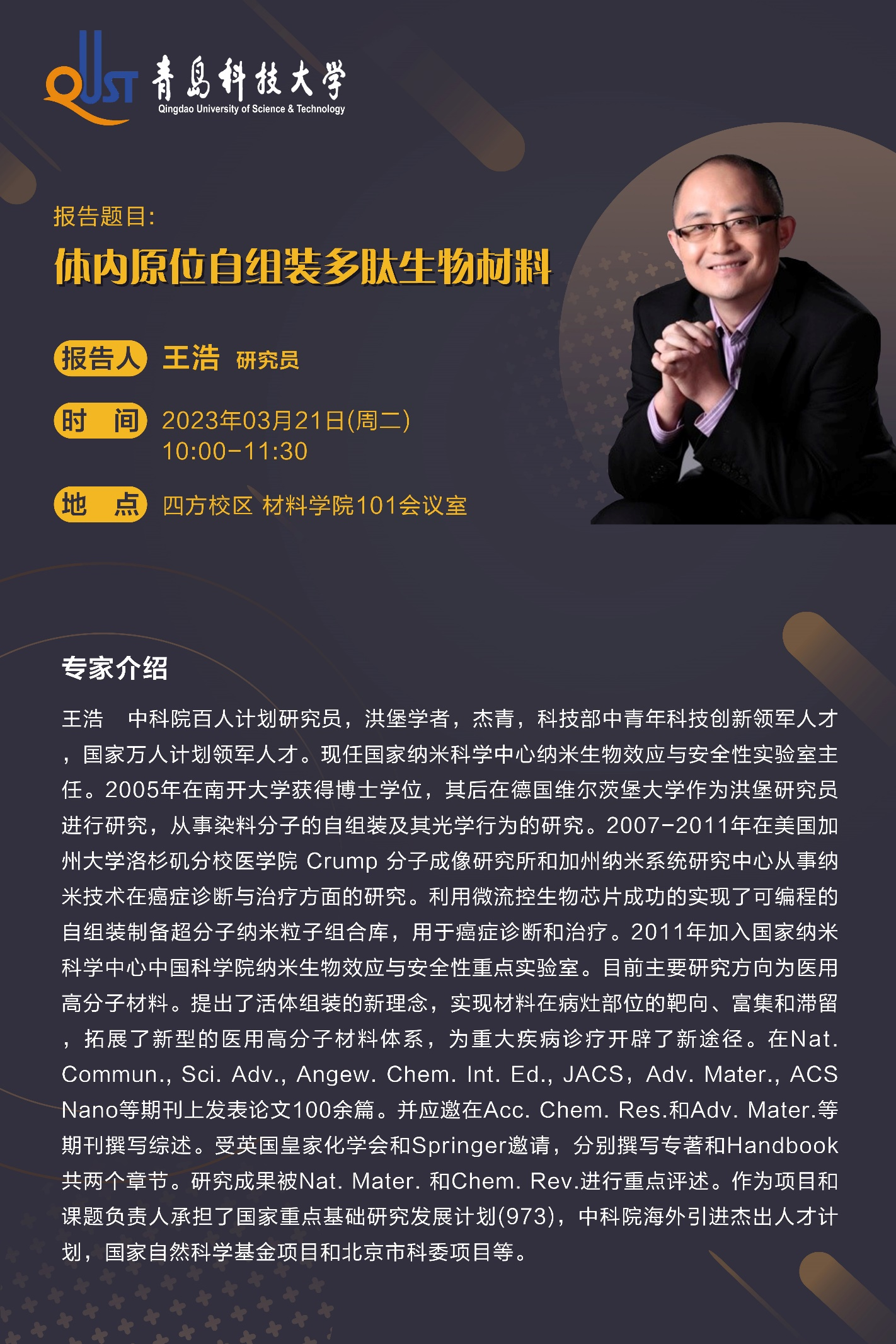 主讲人简介:王浩, 洪堡学者,中科院百人计划研究员,杰青,中青年科技创新领军人才,国家万人计划领军人才。科技部重点研发计划首席科学家(2019),中科院创新交叉团队负责人(2017),国家自然科学基金创新群体骨干(2017),中科院百人计划结题优秀(2016)。现任国家纳米科学中心纳米生物效应与安全性实验室主任。2000年毕业于南开大学化学系,并被保送南开大学化学系直接攻读博士学位,从事超分子自组装体系的构筑及其功能的研究,2005年获得博士学位。同年获得德国洪堡奖学金,在德国维尔茨堡大学(University of Wurzburg)进行可控组装光学活性分子研究。2007年在美国加州大学洛杉矶分校(UCLA)医学院和加州纳米系统研究院(CNSI)进行博士后研究,主要从事纳米材料的制备与表征及其在癌症诊断与治疗中的应用。 2011年受聘于国家纳米科学中心,中科院纳米生物效应与安全性重点实验室。主要从事自组装高分子纳米生物材料研究。发表Nat. Commun., Sci. Adv., Sci. Transl. Med., JACS, Angew. Chem. Int. Ed., Adv. Mater. NSR, Accounts Chem Res, Prog Poly Sci等文章>100篇,参编3部专著章节。美国化学会(American Chemical Society)和美国科学发展学会(American Association for the Advancement of Science)会员,中国化学会和中国生物物理学会会员。作为项目和课题负责人承担了国家重点基础研究发展计划(973),中科院海外引进杰出人才计划,国家自然科学基金项目和北京市科委项目等。
