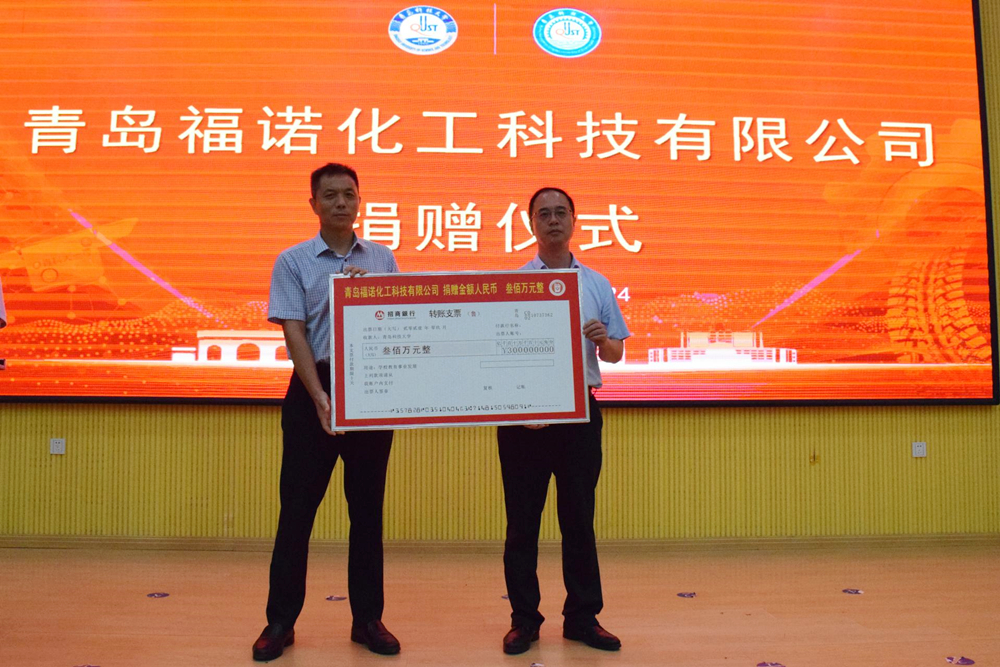 9月24日上午,学校2021年校庆日系列庆祝活动启动暨青岛福诺化工科技有限公司捐赠仪式在四方校区尚舜报告厅举行。党委常委、副校长、校友总会常务副会长韦殿华,青岛福诺化工科技有限公司董事长傅秀成,青岛校友会副秘书长、上海锦天城(青岛)律师事务所主任王宇出席仪式。