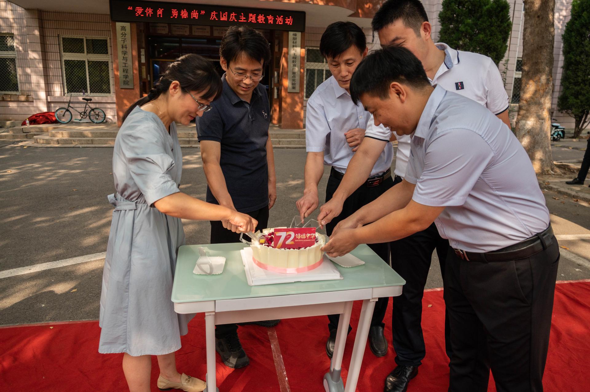校团委书记毛常明、学院院长闫业海、学生处副处长王丽为趣味接力跑获奖同学颁奖。校团委副书记陈兵宣读了《关于高分子科学与工程学院成立体育联盟的批复》。副院长王庆富为篮球俱乐部举办的研究生本科生友谊赛开球。与会领导同切庆祖国72华诞“生日”蛋糕。健美协会进行了排舞展示。