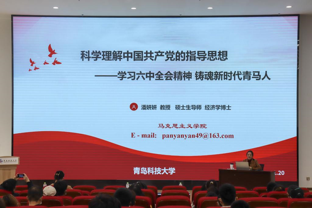 培训中,潘妍妍按照历史逻辑、理论逻辑和实践逻辑,从新中国各发展阶段的时代问题、矛盾以及重要理论指导思想讲起,将十九届六中全会精神凝练为“两个确立”“三个需要”“五大历史意义”“十个坚持”“一个根本问题”“四个必须”和“一个号召”,引导青马学员“扣好进入大学的第一粒扣子”
