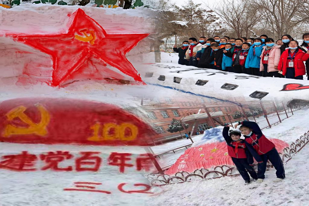 研支团志愿者组织学校1876名学生,以冰雪作笔,以梦想为墨,在洁白的雪地上挥洒出红橙黄绿青蓝色。一字一句记录着冬日的欢歌笑语,一锹一铲堆砌着心中最美的形状,用最真的心感受冰雪之美,26件作品展现出同学们的青春正能量。“红星闪耀”用冰雪展示百年风采,向世界讲好中国故事;“风驰电掣”飞驰在复兴的道路,一起向未来;“二零二二,相约北京”见证冬奥盛会,共筑冰雪强国梦;“红色基因”展现新时代少先队员的昂扬姿态,呼喊出强国有我的青春誓言。