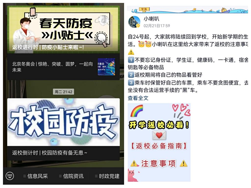 家校互联不松懈,暖心贴示总先行。自开学前期,学院便在官方公众号、小喇叭等平台发布新学期防疫要求和开学系列推文,提醒同学们在家及返校做好疫情防控,同时为新学期新发展新作为做好准备,蓄势待发,创造佳绩。