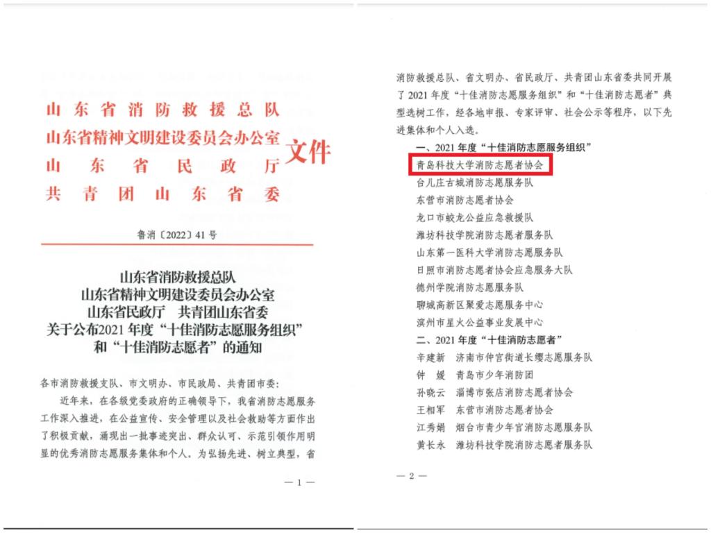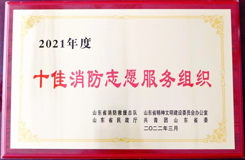 日前,由山东省消防救援总队、山东省精神文明建设委员会办公室、山东省民政厅、共青团山东省委联合开展的全省消防志愿服务典型选树工作中,KY开元保卫处指导的消防志愿者协会经单位申请、专家评审、社会公示等环节,以全省排名第一的成绩,荣获“2021年度十佳消防志愿服务组织”称号。