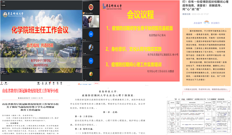 加强组织领导,压实防控责任。学院党政领导靠前指挥,第一时间召开疫情防控线上工作会议,传达学校疫情防控工作会议精神,部署、推进防控工作再落实再落细,确保全院上下一条心,拧成一股绳,同时研判、创新线上教学平台、远程科研安全、管理服务到位等工作,确保线上教学、科研高质量运行。召开班主任、学业导师线上工作会议,要求班主任、学业导师、研究生导师把自己主动摆进疫情防控大局,做好疫情期间学生教育管理工作、“四困生”帮扶工作、毕业生就业督促工作等重点工作。