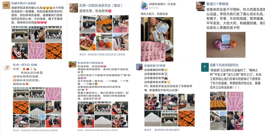 “机电永远的家!”“疫情无情,机电有情”“大爱机电!真的太贴心了!”“青科大yyds!机电yyds!”“我们就是传说中的‘别人家的大学’!”“学校和学院总会送来惊喜”“我们在这里感受到了‘家’的温暖”“前有铁饭碗,后有暖心包,没错,我们就是别人家的学校学生”“超爱青科,超爱机电”“感恩有你,让我们一起静待花开!”“学院的惊喜总是措不及防,刚听闻要发放暖心成长礼包,没想到马上就收到了”,收到这份别样的“暖心礼”后,师生们纷纷晒出了自己对学院的感谢和对战“疫”的信心。温暖的牛奶、香甜的水果、美味的鸡腿,温暖着师生的心、洋溢着浓浓的情,一时间,这份暖心刷爆朋友圈,成为科大校园里的“网红”。学院党委副书记肖强说:“一个鸡腿,虽小但意义深远,是给抗疫路上的青年志愿者助力,也是给今年考研复试的学生加力,更是给广大机电学子强身健体的动力。”“这是一场生动的实践‘思政课’,我被学校学院的做法深深感动,触动心灵的震撼,真诚暖心的惊喜,我一定努力学习,多参加体育运动,多读有益之书”,机电工程学院青年志愿者高艺说道。