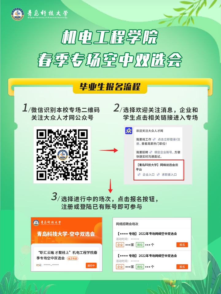 为深入贯彻落实党中央、国务院关于稳就业保就业决策部署,切实做好疫情防控常态化下的毕业生就业工作,日前,机电工程学院举办“职汇云端 才聚线上”春季专场空中双选会,为学院毕业生稳定就业拓路护航。