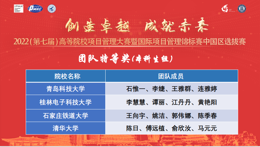 其中,由董华、黄天赐老师指导,石惟一、李婕、王雅群、闫湘琳、连雅婷同学的项目团队获特等奖,团队竞赛总成绩全国第一,并在候选代表中国参加国际项目管理锦标赛的队伍中成绩名列榜首;闫湘琳、杨亚茹、股闯、姜治恒同学的项目团队获三等奖。李婕、石惟一、王雅群个人成绩位列全国前三,取得了KY开元参加历届项目管理大赛的最优成绩。