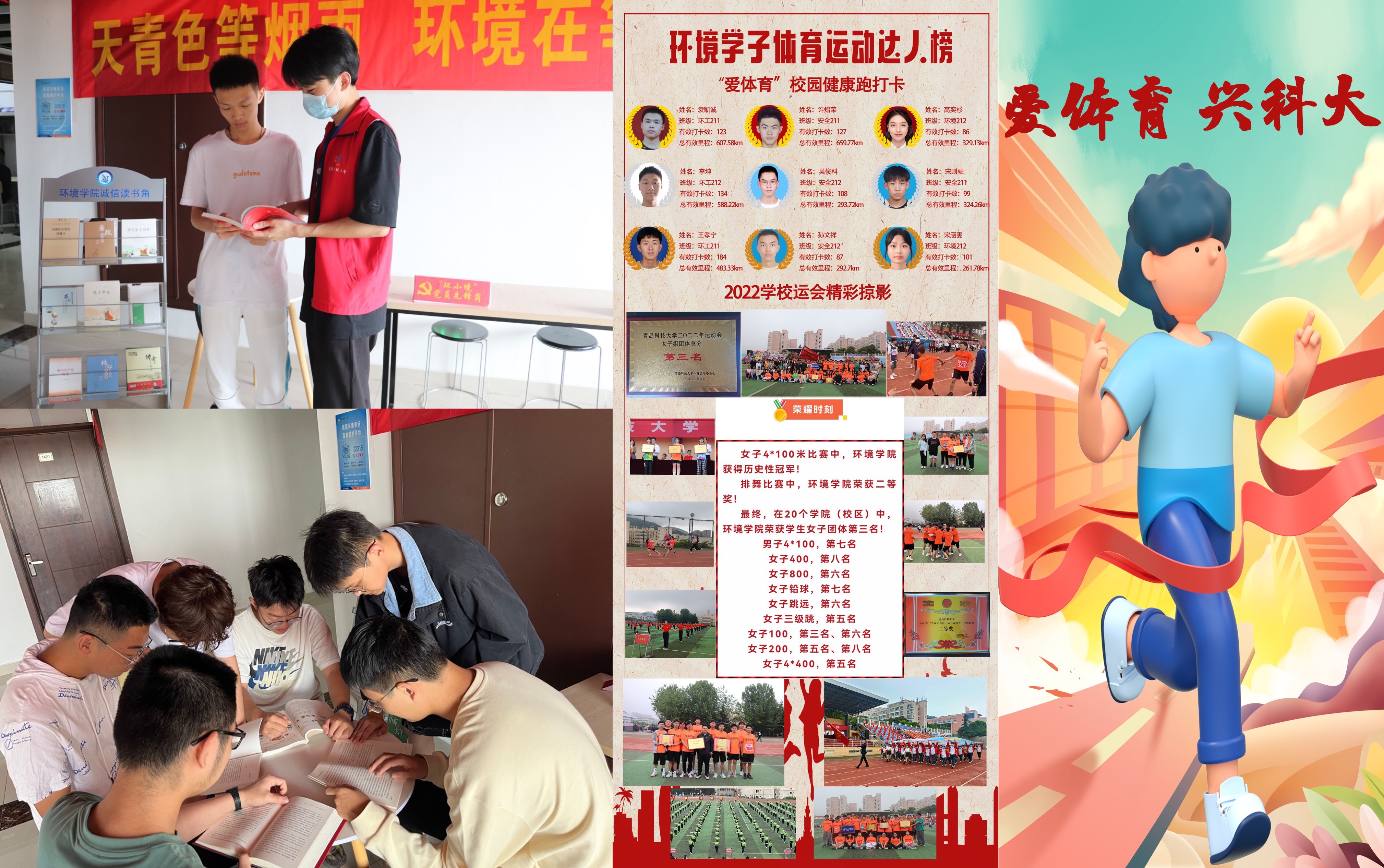 恒心奋进,塑造环境新生全面发展新风尚。学院重视文化建设与宿舍建设对新生养成教育的重要地位,于新生宿舍楼内搭建党建文化角,摆放《习近平与大学生朋友们》《与青年大学生谈做人》等各类书籍,吸引学生驻足享阅,践行“读书学习、健康成长、创新创造、艰辛奋斗”的校园文化主基调。此外,学院制作了“环境学子体育运动达人榜”,将各专业校园健康跑前三甲“悉数上榜”,并将体育综合改革以来环境学子的运动热情与运动成绩予以展示,激励新生强健体能、五育并修全面发展。