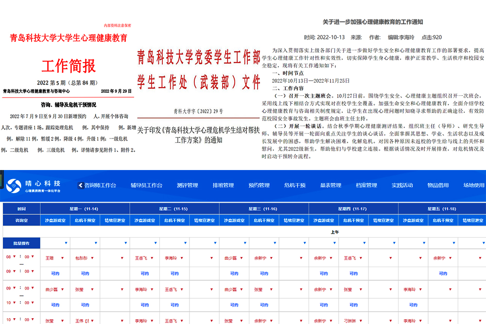建立学校、院系、班级、宿舍“四级”预警防控体系,通过咨询、测评、访谈、排查开展全链条风险防控。建立“5+2”“白+黑”“线上+线下”的不间断、常态化心理咨询服务体系,为学生提供及时、有效的心理健康服务与指导297人次。9月19-22日开展全覆盖心理健康素质测评,依托心理咨询中心和学院心理工作站开展访谈排查2509人次。出台《KY开元集团官网心理危机学生结对帮扶工作机制》(青科大学字〔2022〕29号),扎实落实学院领导班子对心理危机学生结对帮扶,确保责任明晰、信息畅通、跟踪闭环。学校危机干预工作实施“周总结、月汇报”制度,学院内部每周交流汇报危机发展变化,每月向学校提报跟踪管理情况,形成多维度、系统化的学生心理健康动态管理数据库。