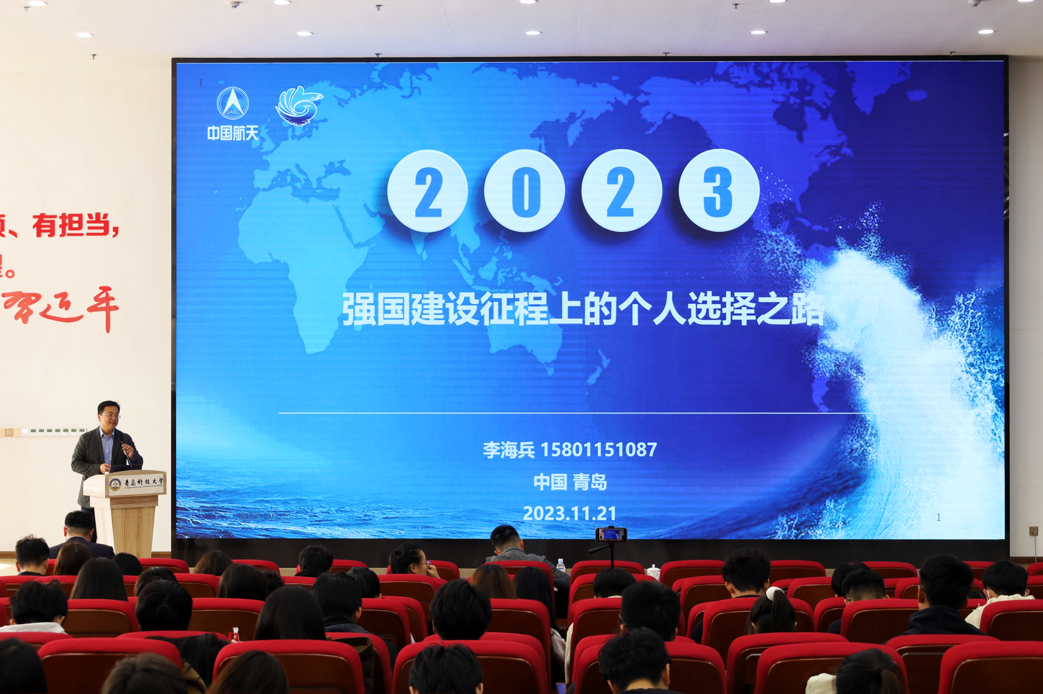 为引导青年学生积极在强国建设、民族复兴伟业中挺膺担当,11月21日下午,学校“共青团促进大学生就业行动”之“就业大讲堂·青年榜样进校园”主题宣讲会在崂山校区北区团学报告厅举行。国家实验室崂山实验室海洋观测与探测联合实验室(航天科技集团部分)副主任李海兵担任主讲嘉宾,500余名青年学生参与本次活动。