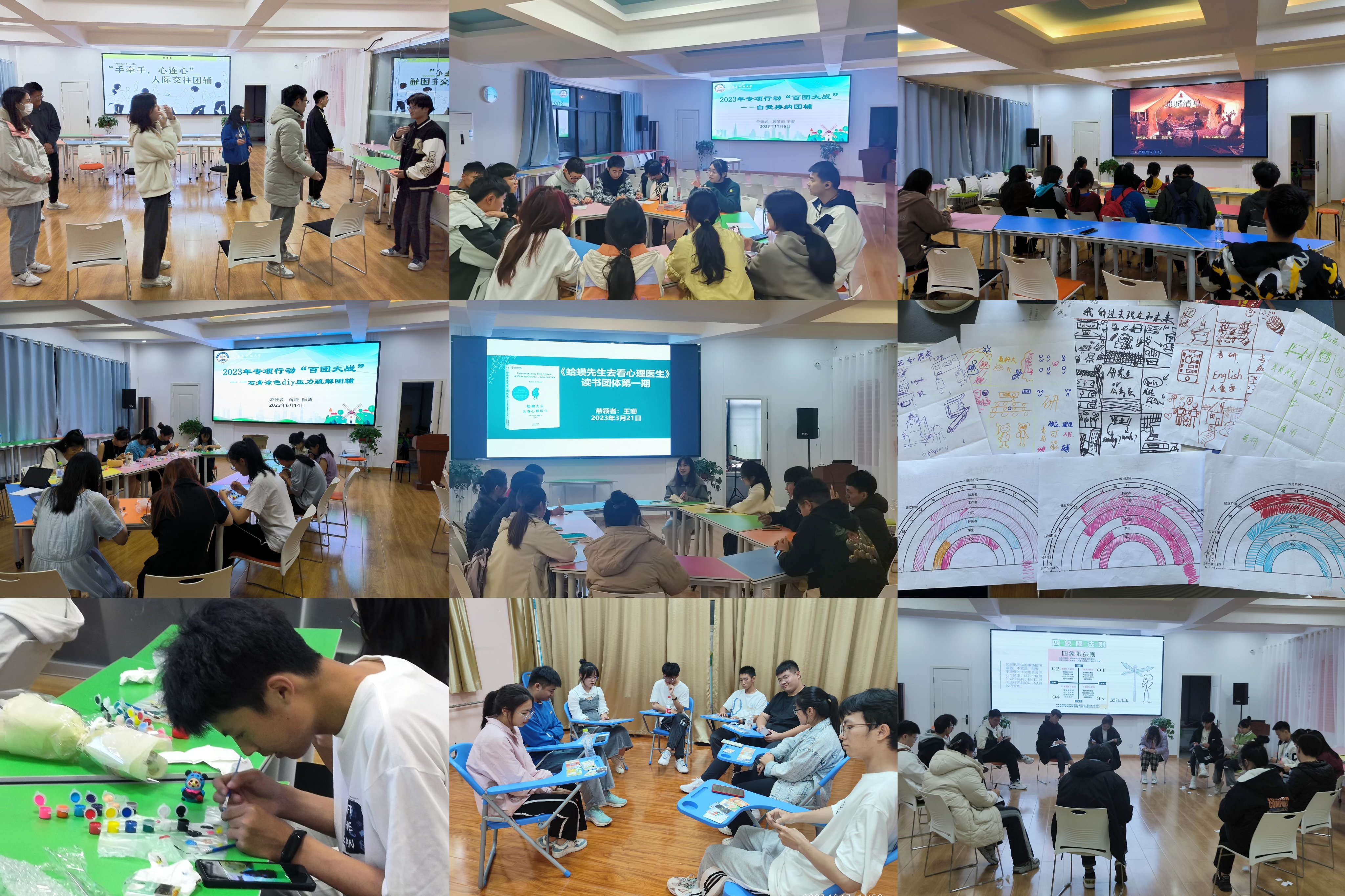 百“团”大战是本年度心理中心创新举措“五个一”计划的重要组成部分,由学校“朋辈小屋”项目孵化的近30名朋辈心理辅导员、心理中心专职教师作为团辅的主要带领者,活动主题均来自前期调研,是“05后”大学生关注的热门话题。带领者通过参加专题培训、开展方案设计、多轮次带课磨课等环节,随后发布招募令,组织有共同需求的同学参与其中。活动以沙龙、读书会、素质拓展等形式,围绕自我意识、情绪管理、生涯规划、压力应对、亲密关系等10余个主题展开,同学们不仅收获了知识,还增进了友谊,活跃着和谐友爱的校园氛围,此项创新工作荣获2023年山东省高校心理健康教育月心理健康教育特色活动一等奖。考试临近,围绕压力管理、考试焦虑等主题的团辅活动正在紧锣密鼓开展中。