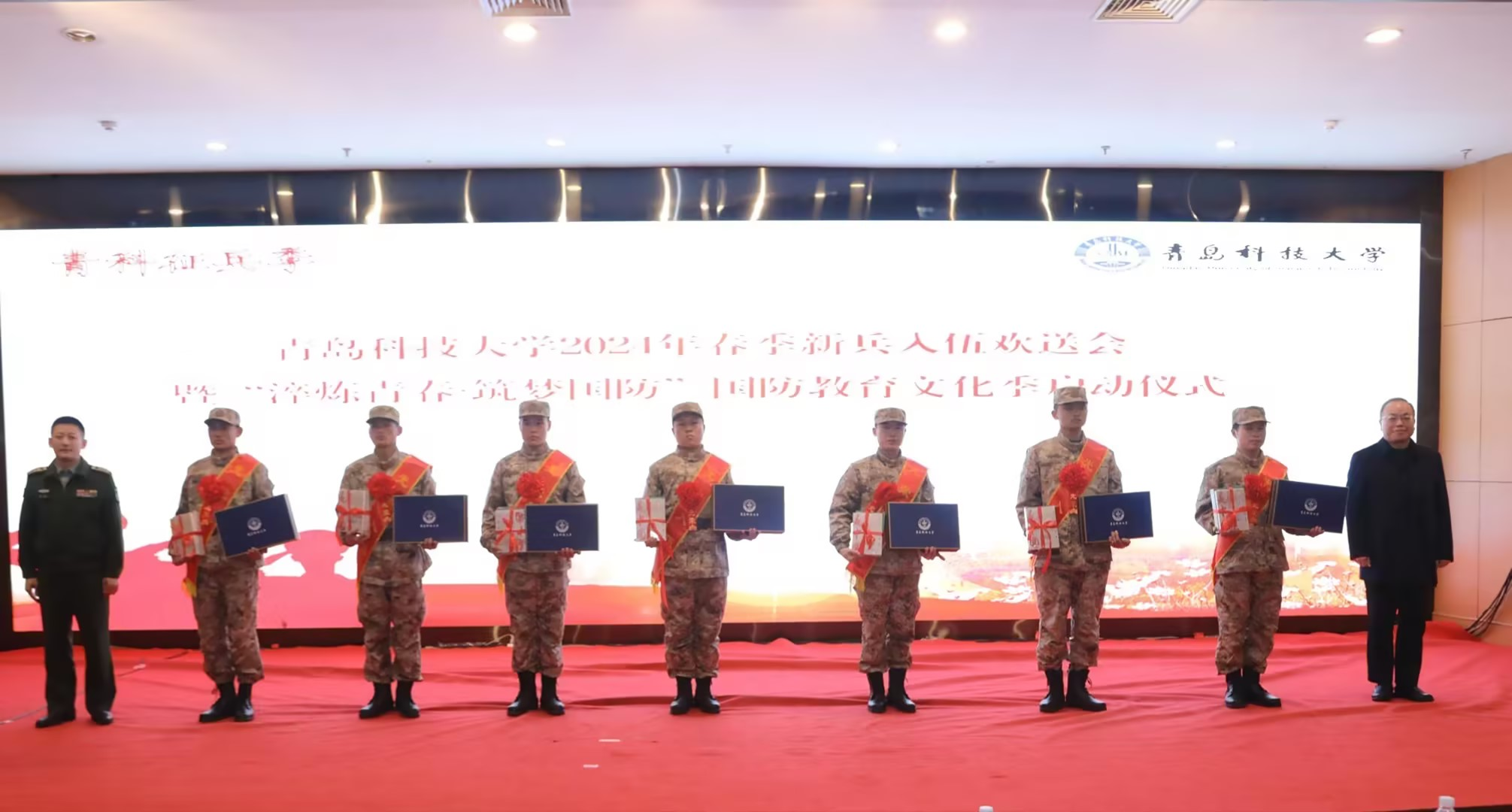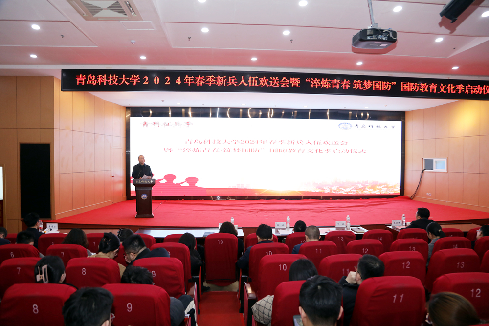 3月14日下午,学校2024年春季参军入伍学生欢送会暨“淬炼青春∙筑梦国防”国防教育文化季启动仪式在崂山校区第三报告厅举行。青岛市市北区征兵办主任、市北区人民武装部部长陈兵,学校党委常委、副校长丁林,党委常委、宣传部长张洪坤出席仪式。