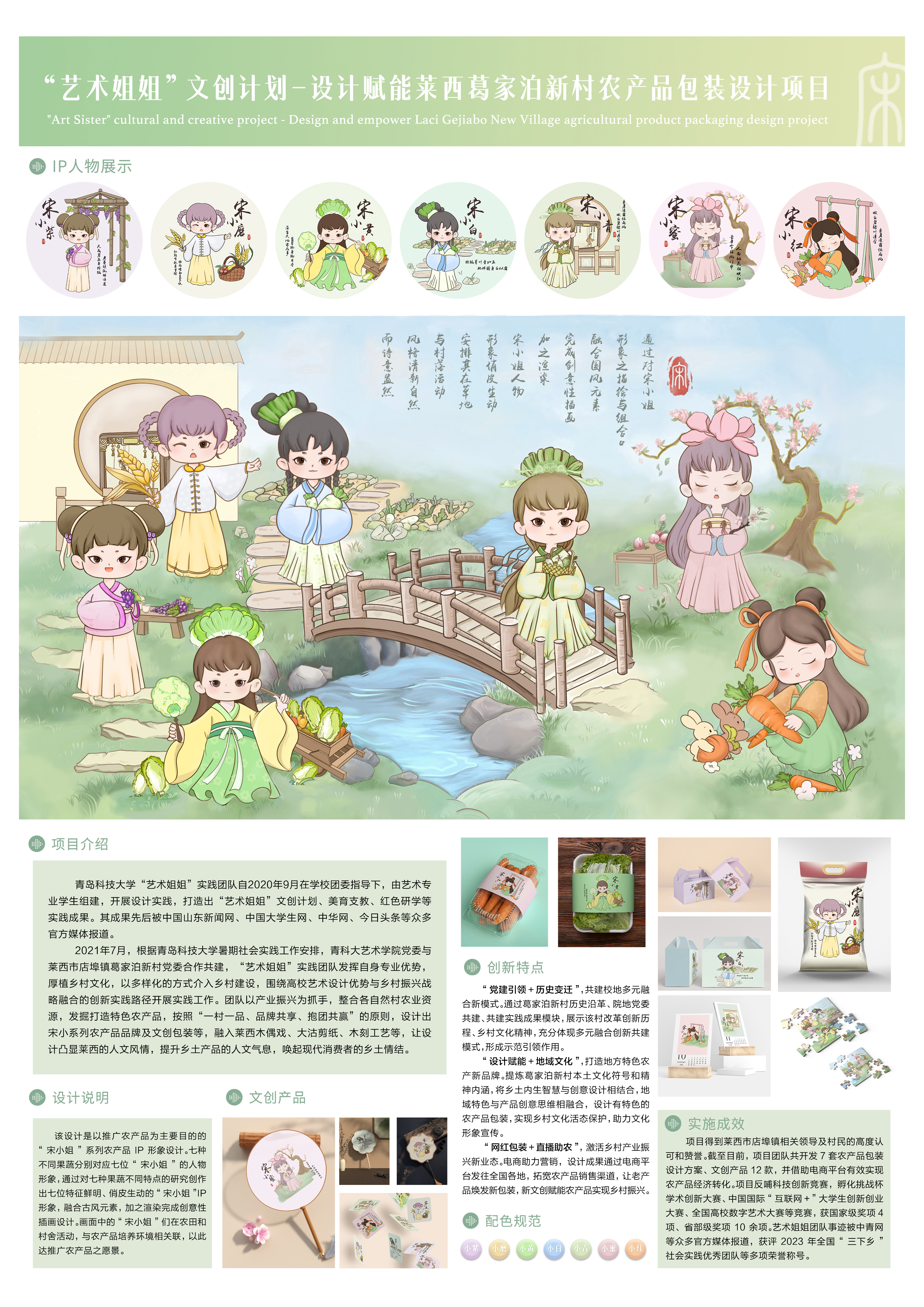 “艺术姐姐”实践团队自2020年9月成立以来,相继打造出“艺术姐姐”文创计划、美育支教、红色研学等社会实践成果。艺术学院党委与莱西市店埠镇葛家泊新村党委合作共建后,实践团队发挥自身专业优势,厚植乡村文化,以多样化的方式介入乡村建设,围绕高校艺术设计优势与乡村振兴战略融合的创新实践路径开展实践工作。团队以产业振兴为抓手,整合各自然村农业资源,发掘打造特色农产品,设计农产品品牌及文创包装。“‘艺术姐姐’文创设计——设计赋能莱西葛家泊新村农产品包装设计项目”是学校“艺术姐姐”社会实践队在乡村实践过程中主动服务乡村振兴战略所需、立足莱西葛家泊新村实际催生的社会实践成果。
