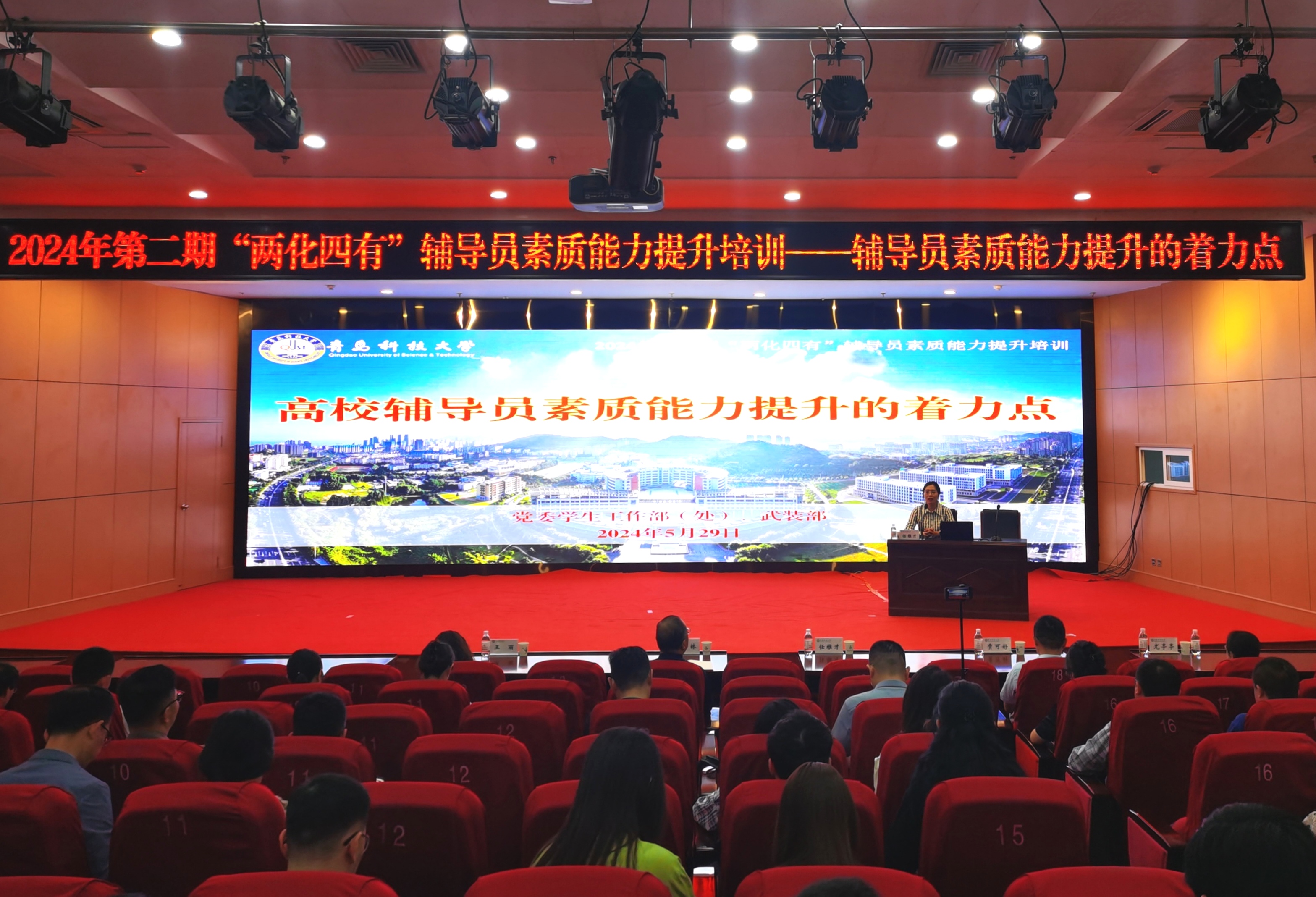 5月29日上午,学校在崂山校区英科(第三)报告厅开展“两化四有”辅导员素质能力提升培训。全国首批最美高校辅导员、全国高校辅导员年度人物、北京师范大学任雅才副研究员为全校辅导员做专题培训,党委常委、副校长丁林,党委学生工作部部长王丽参加培训。培训由党委学生工作部副部长尤亭亭主持。
