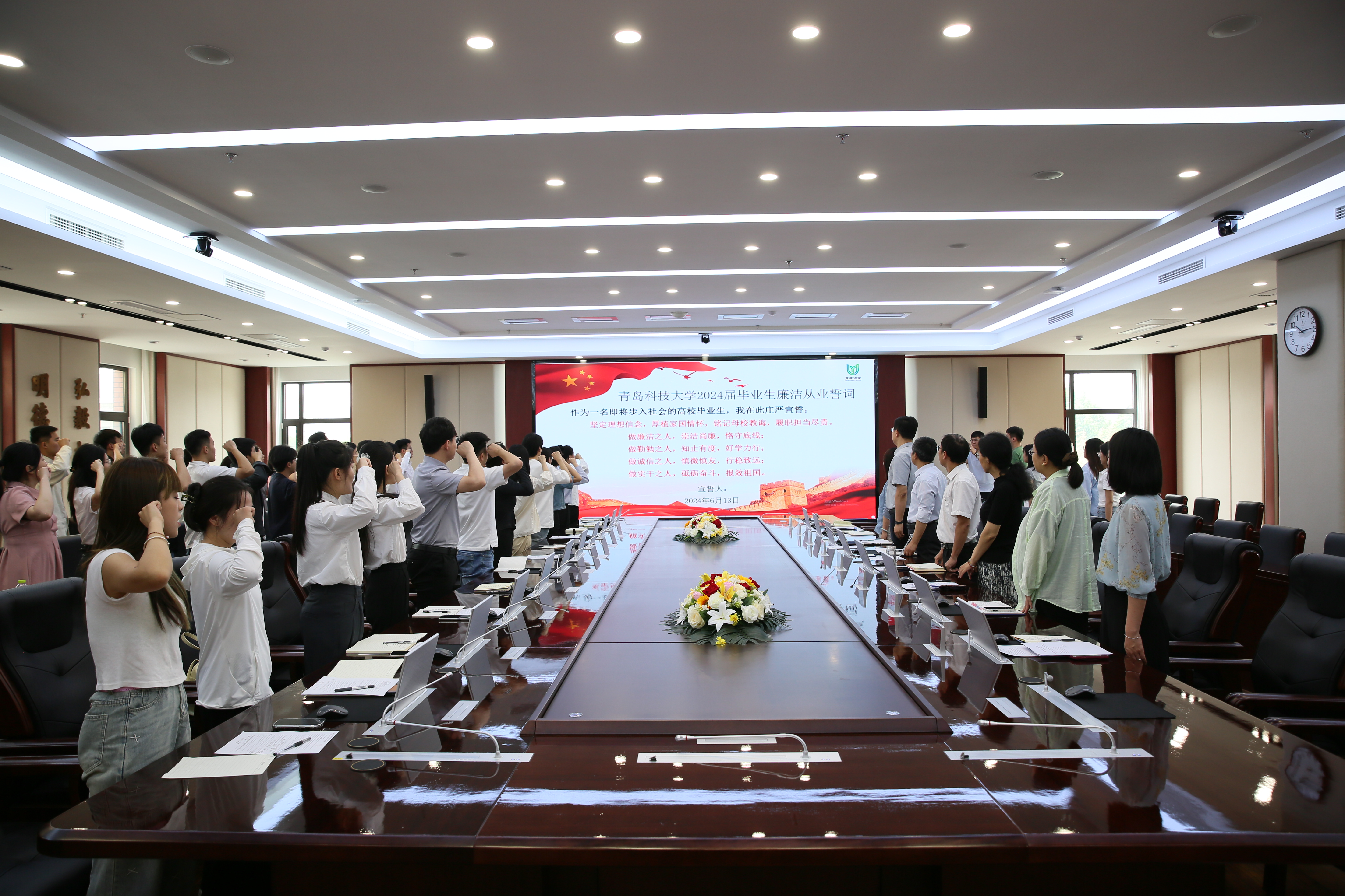 王磊宣读廉洁从业倡议书,并深情寄语毕业生党员要廉洁修身、清新自守,正道直行、行稳致远。衷心期盼同学们时刻铭记“明德、笃学、弘毅、拓新”的校训,以道德浸润心灵、以廉风涵养正气、以纪律规范行为、以奋斗淬炼成长。