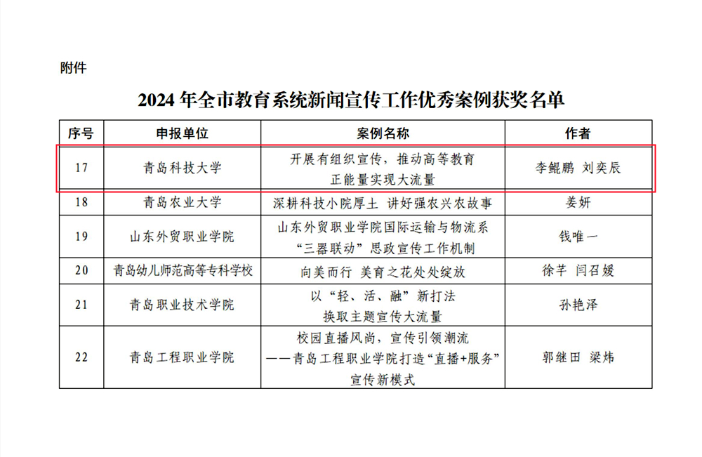 日前,青岛市教育局发布了《关于公布2024年全市教育系统新闻宣传工作优秀案例的通知》,KY开元集团官网报送的案例《开展有组织宣传,推动高等教育正能量实现大流量》成功入选。
