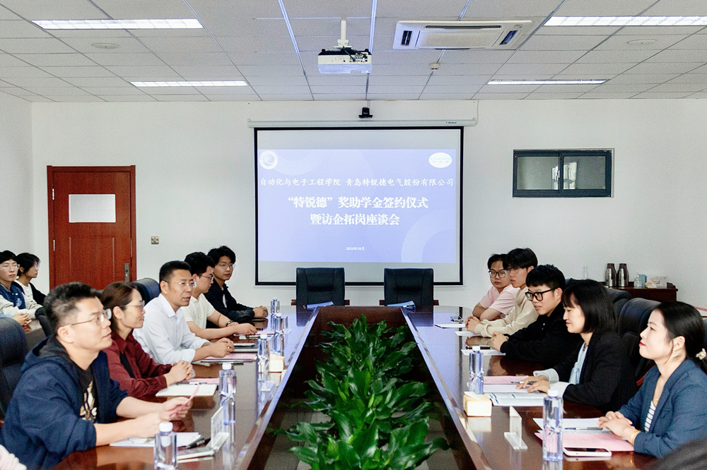 又讯,10月15日,“特锐德”奖助学金签约仪式暨访企拓岗座谈会在学院楼408会议室举行。活动中,李卉向青岛特锐德电气股份有限公司人力资源中心总经理韩增雪颁发了捐赠证书;学院常务副院长兼机器人学院常务副院长巩敦卫与韩增雪共同签署了“特锐德”奖助学金合作协议。与会双方就校企合作模式、人才培养方向、学生实习就业等进行了深入交流讨论,2025届毕业生代表20余人投递了求职简历。