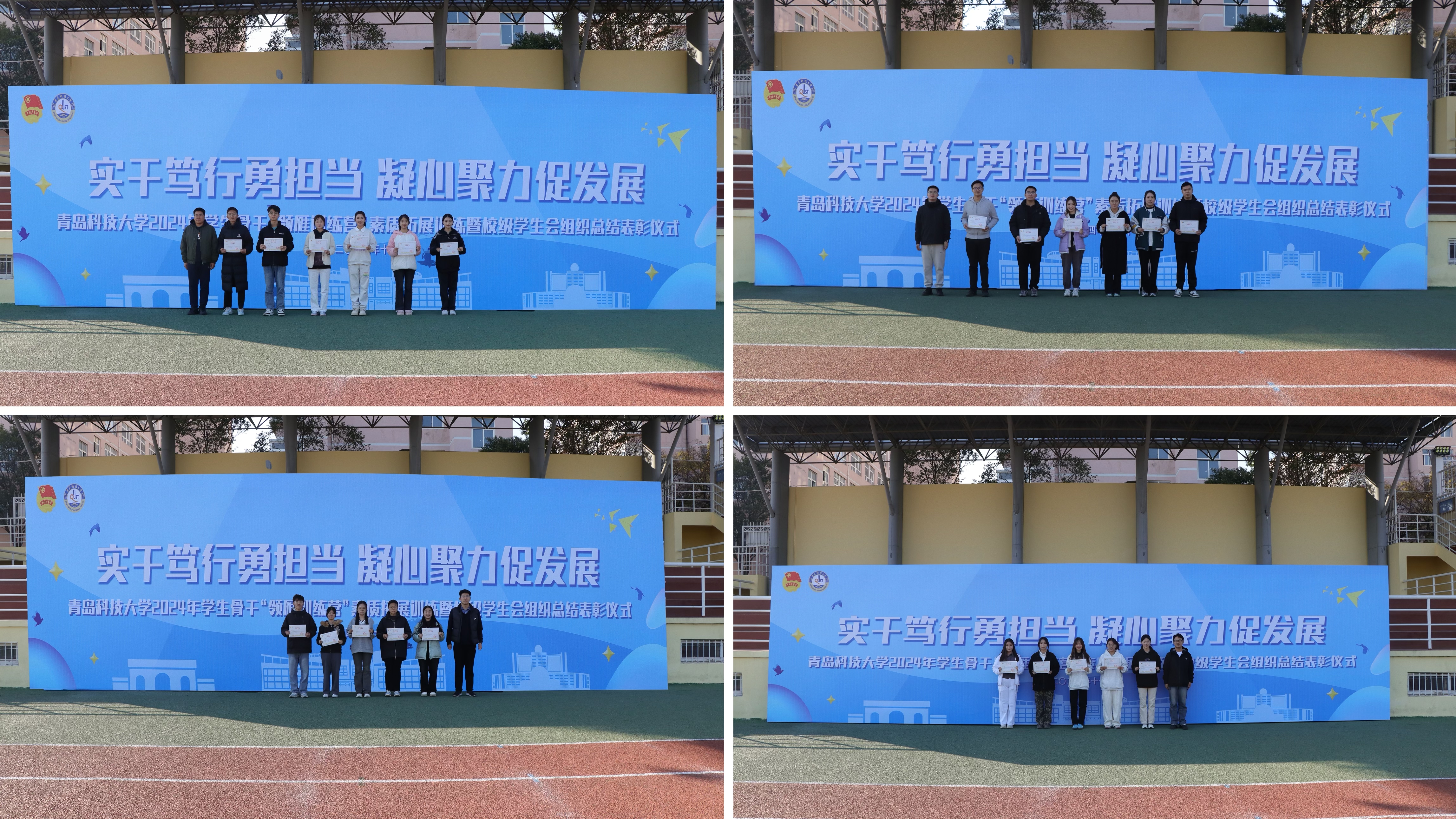 11月23日,学校2024年学生骨干“领雁训练营”素质拓展训练暨“实干笃行勇担当 凝心聚力促发展”校级学生会组织阶段总结会在崂山校区南苑运动场举行,学校团委相关负责人、“青马工程”领雁训练营成员及校学生会、研究生会全体成员参加活动。