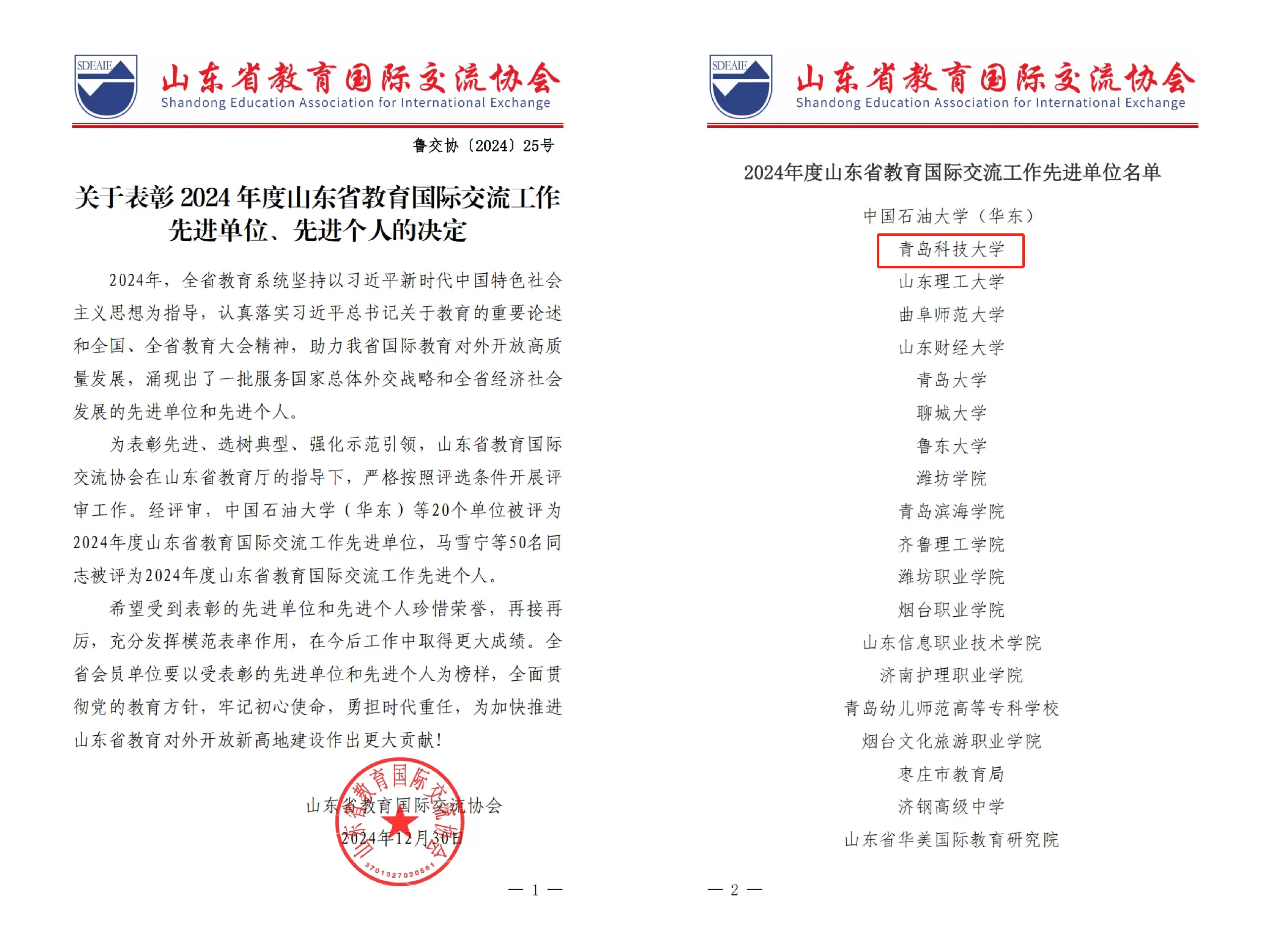 近日,山东省教育国际交流协会发布了《关于表彰2024年度山东省教育国际交流工作先进单位、先进个人的决定》,学校荣获“山东省教育国际交流工作先进单位”称号。