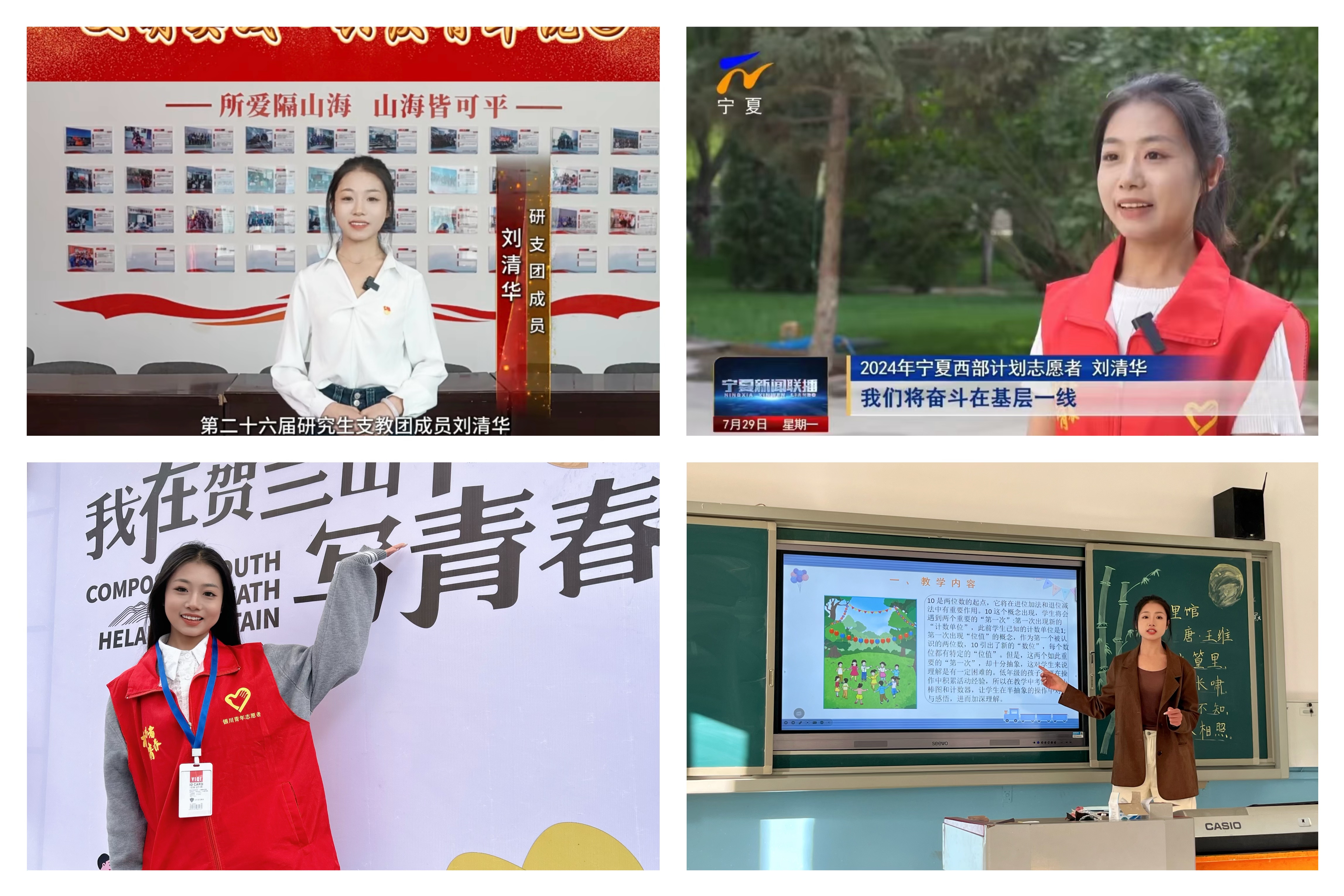 刘清华,数理学院数学与应用数学专业201班学生,现任第26届研究生支教团宁夏自治区银川市兴庆区分队队长。曾荣获挑战杯红色专项省级一等奖、青岛市千名优秀大学生、校“十大自立自强标兵”、优秀共青团干部等荣誉称号20余次。在校期间积极投身志愿服务,带领“百村百校·科普数理”志愿服务团队入选“七彩假期”全国百支优秀队伍,志愿服务时长达700余小时。2024年入选第26届中国青年志愿者扶贫接力计划研究生支教团,服务于宁夏回族自治区银川市兴庆区。个人在2024年兴庆区第一届教师风采大赛荣校级评比活动中荣获说课、才艺展示一等奖、课堂教学二等奖,打造实践品牌“七彩少年·成长成材”入选“七彩假期”宁夏示范团队,个人课堂风采展示入选共青团中央宣传视频,个人事迹被西部志愿汇、中国青年志愿者、中国青年报等多家媒体报道,被宁夏电视台、宁夏日报等多家媒体采访。