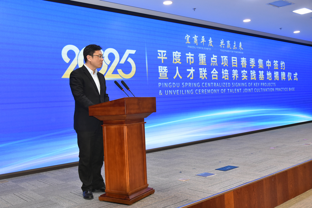 2月18日上午,平度市举行2025年重点项目春季集中签约暨人才联合培养实践基地揭牌仪式。学校党委常委、宣传部部长张洪坤受邀出席仪式并致辞。青岛市政府副秘书长,市高质量招商引资指挥部办公室执行主任张琳到会指导。平度市委书记赵兴绩,市委副书记、市长张宏业出席签约仪式。平度市委常委、统战部部长、副市长宋雪峰主持仪式。