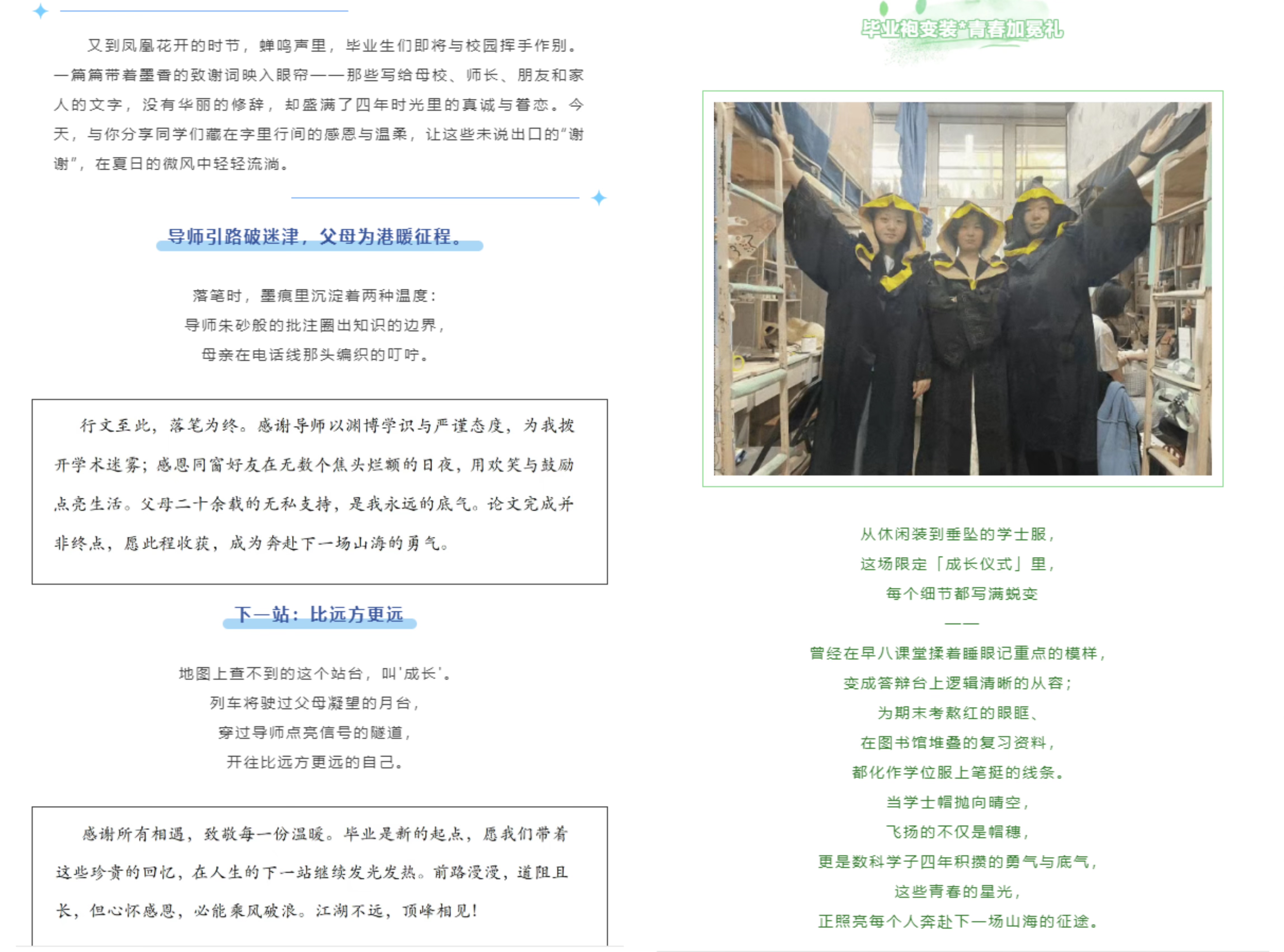 “忆”存青春档:时光里的“智能纪念册”。学院开展“纸短情长・学术长河里的星光”毕业论文致谢征集活动,聚焦学术成长感恩叙事,为毕业生搭建情感表达平台,留存珍贵成长记录,传递温暖与力量。开展“时光刻度・成长映像”大学四年对比照主题征集活动,通过征集对比影像并利用AI模型生成动态渐变对比视频,定格青春印记,见证成长轨迹,成为承载学生大学四年回忆的独特文化载体,也进一步弘扬学院的文化精神。