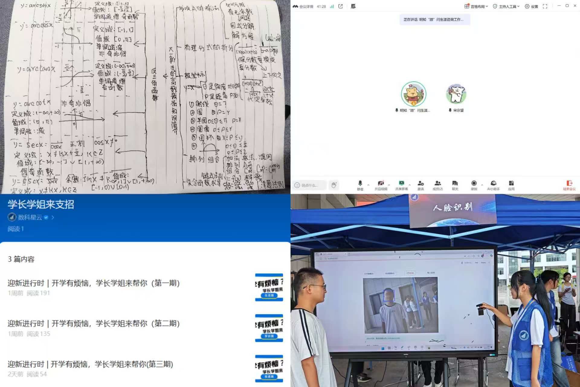 全周期场景覆盖,打造迎新服务“无缝链”。学院连续三年开展“未入校,先入学”活动,以 “时间轴” 为脉络,覆盖新生从假期到入校的全周期需求,实现“高大衔接”的平稳过渡。早在8月上旬,假期开展“学好一门课、读好一本书”假期衔接班,学院便启动“学术预热计划”,为新生精选《数据科学导论》《人工智能算法基础》等入门书籍,配套线上课程资源包,帮助新生提前克服 “专业畏难情绪”;针对部分新生“目标不清、方向不明”的问题,学院依托职业生涯规划揭榜挂帅项目,组织职业规划导师为50余名新生开展“1对1”线上咨询,帮助新生初步明确发展方向;开学前两周,领航学长学姐推出“开学有烦恼,学长学姐来支招”系列内容,通过“行李打包清单”图文、“宿舍生活小技巧”短视频、“选课避坑指南”直播等形式,覆盖新生高频疑问,不少新生留言“看完视频,开学焦虑少了一半;迎新当天设置全流程服务岗,融入数据科学学科特色的“人脸识别系统”快速核验新生身份,兼顾科技感与便捷性,提升报到效率。