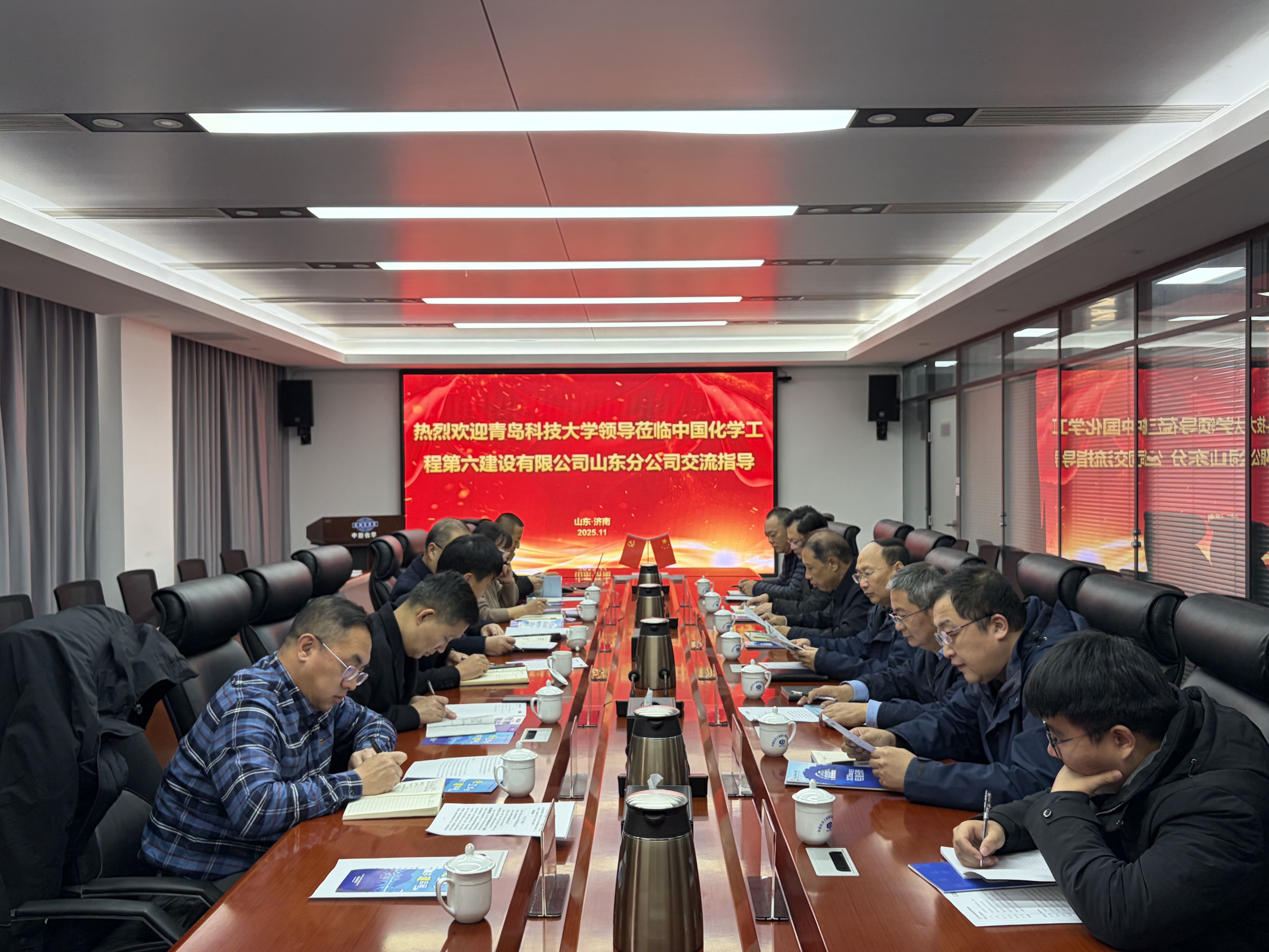 26日上午,丁林一行抵达中化六建山东分公司,六建山东分公司经理张宁海,副经理兼总工程师简逖,副经理刘军、姚成龙,总会计师薛红波,校友代表项目经理、化工工艺05届吴瑞光和项目安装技术员、机械设计制造及自动化23届黄保帅等接待了丁林一行,双方就人才培养、科研合作、毕业生就业等方面进行了深入探讨,并就深化合作达成一致意见。