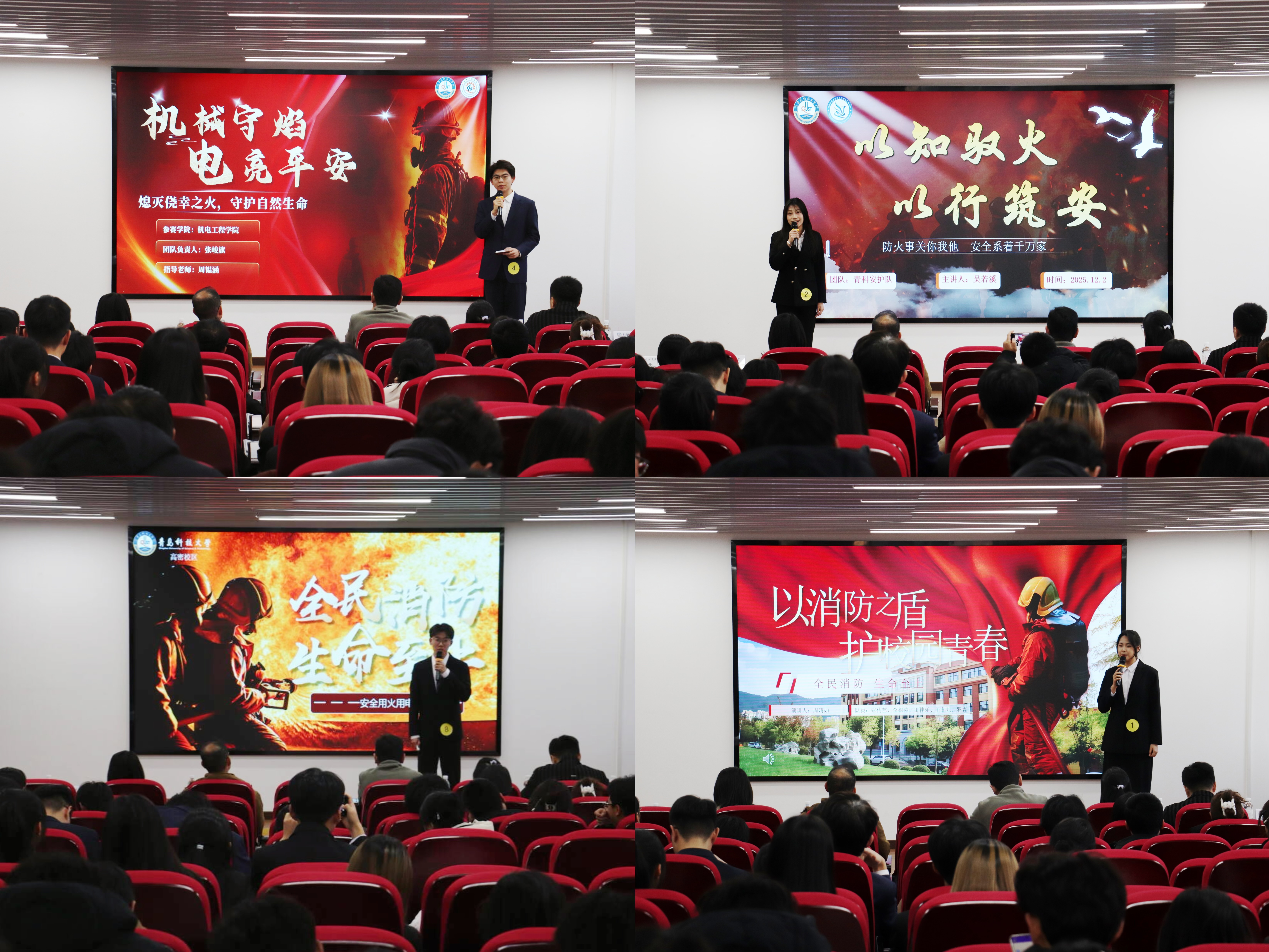 比赛在第34个消防安全月宣传视频中拉开序幕,视频中一个个触目惊心的火灾案例、一组组令人警醒的数据,让在场师生深刻认识到消防安全的重要性。决赛分为“主题演讲、知识问答、视频展示”三个环节。在主题演讲环节,选手们围绕“全民消防、生命至上——安全用火用电”主题,结合校园生活实例,用真挚的情感、生动的语言,传递着消防安全意识,彰显青科学子对生命安全的重视以及勇于担当社会责任的担当;在知识问答环节,选手们凭借扎实的消防知识迅速准确作答;在视频展示环节,各队聚焦宿舍、实验室等校园场景,以短视频的形式,还原隐患排查、火情处置等流程,生动的剧情、逼真的场景,让消防知识变得更加直观、易懂,现场掌声不断。