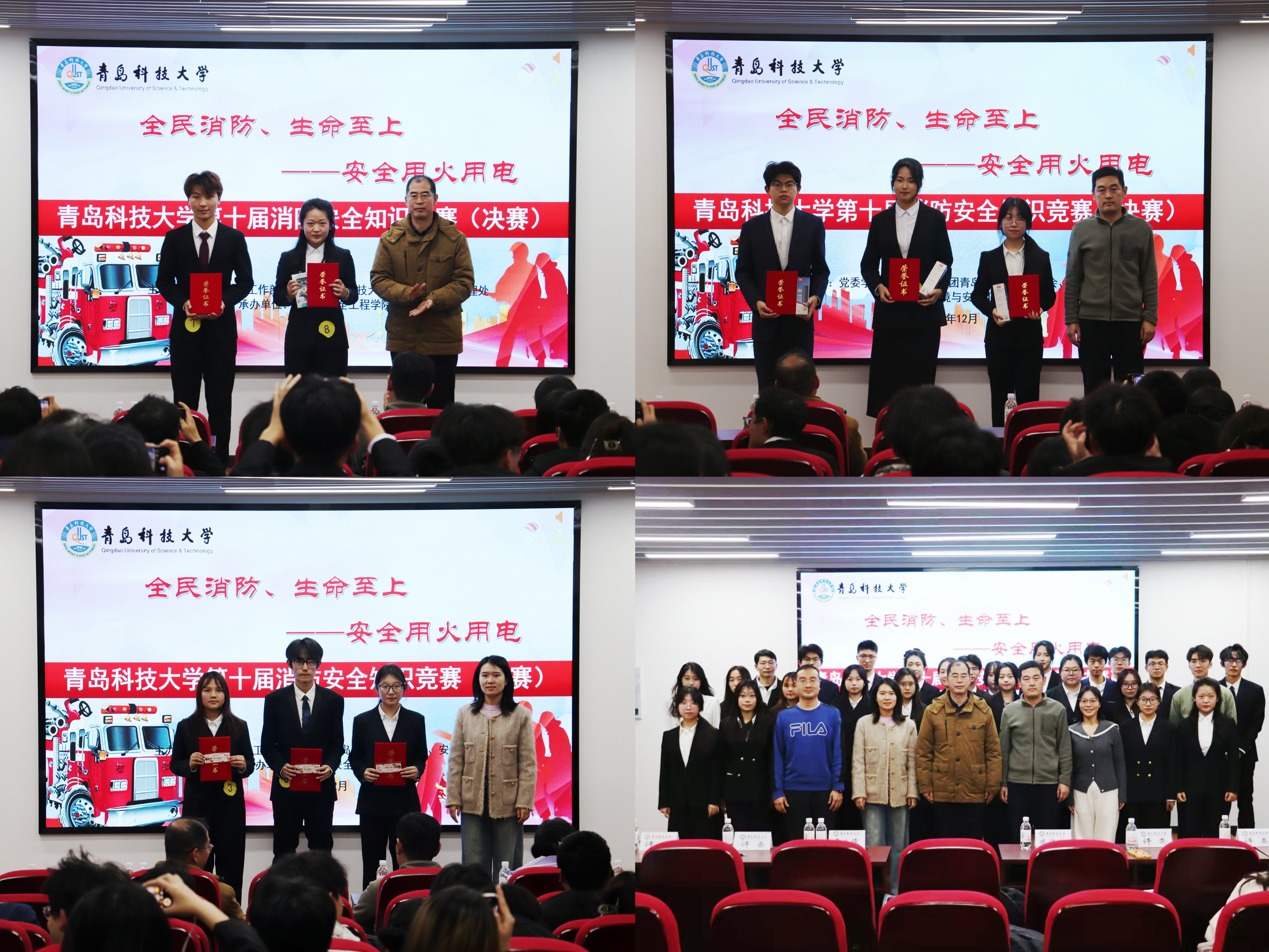 2025年11月是第34个“全国消防月”,为筑牢校园消防安全防线,提升大学生安全应急能力,12月2日,“全民消防、生命至上——安全用火用电”第十届大学生消防安全知识竞赛决赛在四方校区举行。3个校区8个学院相关负责人及师生代表参加此次决赛。
