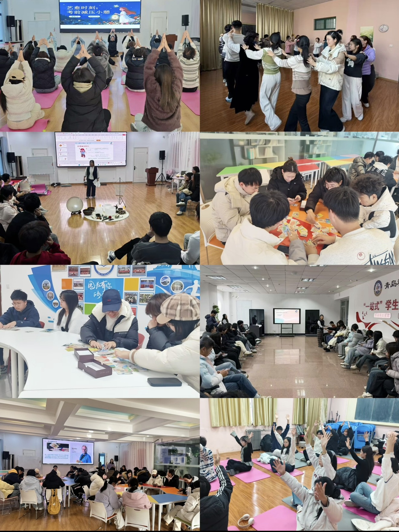 针对不同学院专业特点、学生群体特质的差异化需求,心理中心精准施策、定制方案,充分依托“一站式”学生社区、各学院配备的团辅功能室、大学生活动中心、辅导员发展中心、心理中心团辅室等分布于校园各处的功能场地,活动现场,教师们融合颂钵疗愈、正念减压、舞动疗愈、OH卡牌等多元形式,引导学生释放备考积压的紧张情绪,掌握科学的情绪调节方法,缓解考试焦虑。