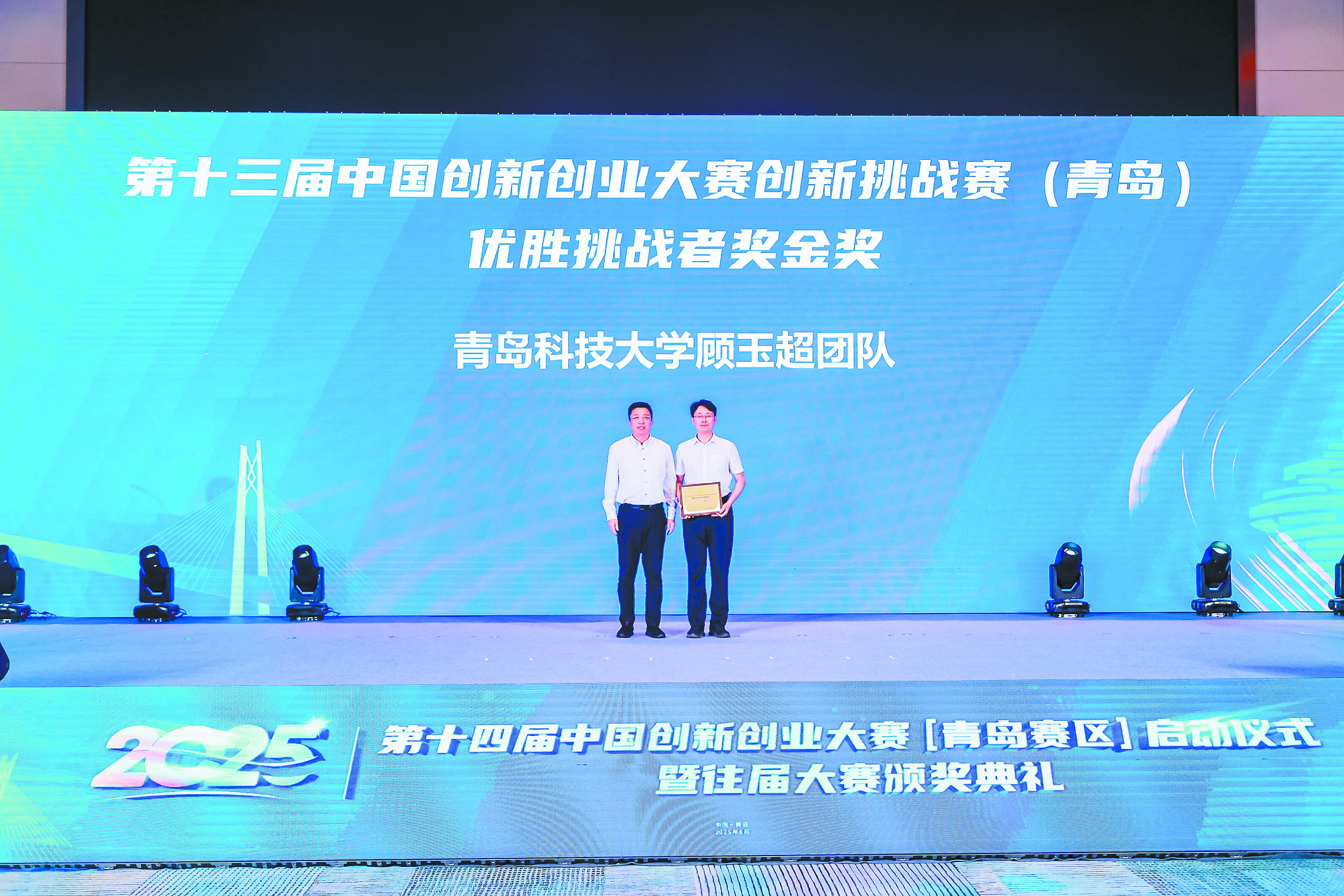 2025年6月11日,第十四届中国创新创业大赛(青岛赛区)启动仪式暨往届大赛颁奖典礼活动在青岛高新区举行。顾玉超教授带领团队聚焦行业技术痛点,以“iPSC来源的膀胱癌双靶点纳米抗体CAR-T细胞开发”这一极具创新性的解决方案,在第十三届中国创新创业大赛(青岛赛区)创新挑战赛中脱颖而出,斩获唯一的“优胜挑战者金奖”,并与企业成功签约,成为学校产学研合作的典范。