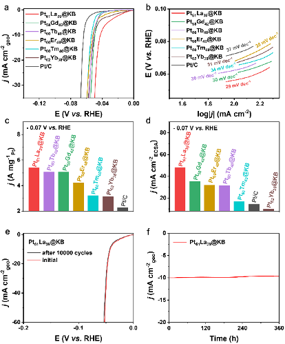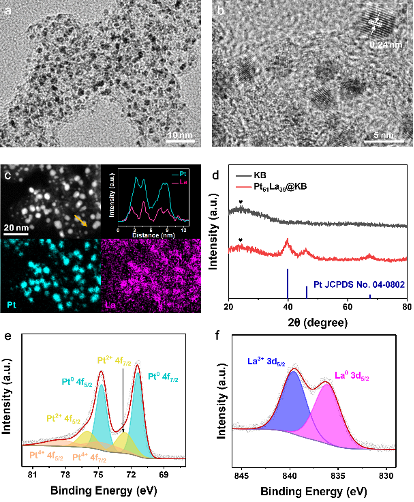图1. Pt61La39@KB的表征。a) TEM图像。b) HRTEM图像。c) TEM元素映射。d) XRD图谱。e) XPS Pt 4f图谱。f) XPS La 3d图谱。