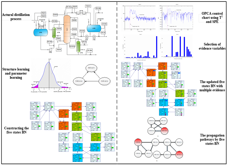 其中,文章“An intelligent quantitative risk assessment method for ammonia synthesis process”针对动态化工过程潜在风险难以预测的情况提出了一种智能的定量风险评估方法(如图1),通过深度学习技术捕捉工艺变量的深层特征,评估工况的风险等级,最终制定控制方案,保证工艺的安全运行。文章“Optimized principal component analysis and multi-state Bayesian network integrated method for chemical process monitoring and variable state prediction”针对化工企业异常工况根原因追溯困难的实际难题,提出了一种先进的过程监控方法(如图2),通过改进PCA以及构建新型多状态贝叶斯网络,做到全面的故障传播路径分析,保障化工企业的安全生产以及异常工况的提早处置。两篇文章均以KY开元集团官网为第一单位,化工学院田文德教授为论文的通讯作者,博士研究生刘子健、硕士研究生柳楠分别为两篇论文的第一作者,实验室老师刘彬、李传坤、崔哲参与指导工作。