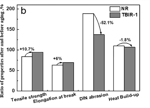 最后,研究了TBIR及NR硫化胶热氧老化前后的物理机械性能变化(图4)。结果表明TBIR硫化胶经热氧老化后的物理性能保留率更高。