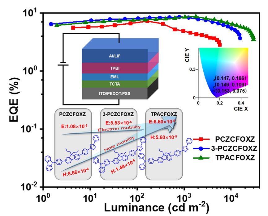 团队成员围绕这一关键问题,在高效率纯有机蓝光材料迁移率与OLED器件方面取得新进展。创新性地设计合成了基于苯基咔唑、三苯胺为电子给体(D)、噁二唑为电子受体(A),芴为共轭桥(π)的D-A型和D-π-A型两种体系有机蓝光分子,系统地研究了不同分子结构特点对有机蓝光分子的光物理性质、热性质、电性质及非掺杂OLED蓝光器件性能等方面的影响规律。研究发现:在D-π-A型分子体系中,芴桥的引入具有双重功能作用,既可以形成杂化局域电荷转移激发态(HLCT态),赋予蓝光分子较高的荧光效率,又可以调控分子间合适的堆积模式,提高/平衡载流子迁移率。通过调控不同给体结构的种类和键接位置,可以实现蓝光分子的空穴迁移率逐渐提高并达到平衡(TPACFOXZ:空穴迁移率为5.60 × 10−5cm2V−1s−1和电子迁移率为6.60 × 10−5cm2V−1s−1)和光色的调控(深蓝光到蓝光发射)。基于D-π-A型分子TPACFOXZ为发光层的非掺杂器件结构,实现了低启亮电压(2.6 V)、高外量子效率(~10%)、高发光亮度(32375 cd/cm2)和高色纯度(CIE: 0.147, 0.186)的非掺杂蓝光OLED器件,且当发光亮度在1000 cd/m2时,器件的外量子效率无任何效率滚降,显示出优异的器件稳定性,这是目前国际上报道的同类非掺杂结构蓝色荧光OLED器件中的最佳性能。该研究成果为设计高效率和高/平衡载流子迁移率的深蓝到蓝光发射的荧光材料提供了可行的分子设计新策略,揭示出芴为π共轭桥可以使一些构型扭曲较大,本来无法形成规整堆积的给体,通过芴桥π堆积作用的调控能够形成有效的载流子传输通道提高OLED器件性能,同时也展现出芴为π共轭桥的D-π-A型结构蓝光分子在OLED显示和照明领域中具有巨大的商业应用价值。
