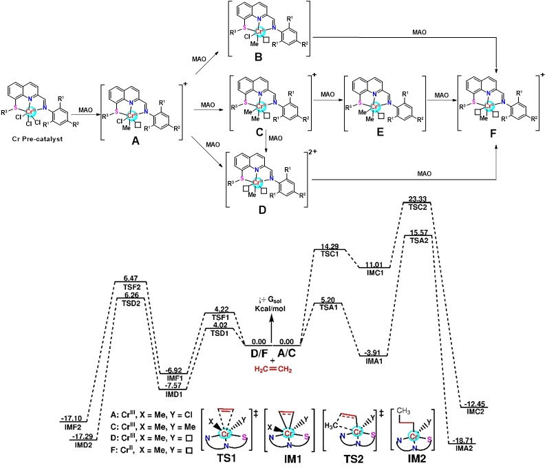 研究人员通过原位紫外对催化剂及活性中心进行了研究,并结合DFT理论计算,提出了双活性中心制备双峰聚乙烯的机理(图3)。铬金属催化剂与助催化剂MAO相互作用,能够生成A-F六个潜在的活性中心。由于B和E为电中性化合物,不利于乙烯单体配位,因此不可能为存在的活性中心。根据DFT理论计算,C中间体配位的能垒远高于A中间体,因此在低MAO用量条件下,活性中心主要为A,可以制备低分子量聚乙烯腊;而在高MAO用量条件下,D中间体和F中间体配位和插入反应的能垒非常相似,均可能存在,制备了高分子量聚乙烯。这一结果也说明了对于铬系聚烯烃金属催化剂(包括非均相的Phillips催化剂),其Cr活性中心的氧化态很难确定,仍旧是该领域研究的难点。