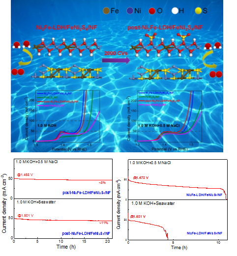 海水约占全球水资源的96.5%,被认为是水电解制氢工程取之不尽的原料。然而海水电解的最大挑战来自Cl-的氧化和及其对催化剂的腐蚀。基于此,本工作先通过控制水热时间对泡沫镍上生长的Ni2Fe-LDH进行部分硫化,制备了镍铁层状双金属氢氧化物/硫化镍铁异质结构(Ni2Fe-LDH/FeNi2S4/NF),该催化剂具有丰富的异质界面、良好的导电性和碱性水氧化催化活性;经2000圈CV活化后,后催化剂post-Ni2Fe-LDH/FeNi2S4/NF表面形成了可以排斥氯离子到达催化剂的活性位点硫酸盐层,使该后催化剂具有优良的耐氯离子腐蚀的性能。因此,在碱性模拟海水溶液中,post-Ni2Fe-LDH/FeNi2S4/NF的析氧催化性能明显优于未活化的催化剂Ni2Fe-LDH/FeNi2S4/NF。当达到100 mA cm−2的电流密度时,前者只需要250 mV的过电位,明显低于后者相应的电位250 mV;前者在达到50 mA cm−2的电位下,计时电流测试20 h后电流密度衰减为8%,在同样条件下,后者运行10 h后电流密度降低约40%。