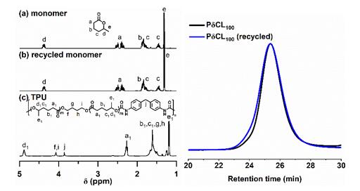 图4.(左)原始δCL,回收的δCL以及聚氨酯的1H NMR谱图;(右)原始δCL单体(黑线)和回收单体(蓝线)制备的PδCL的GPC曲线。