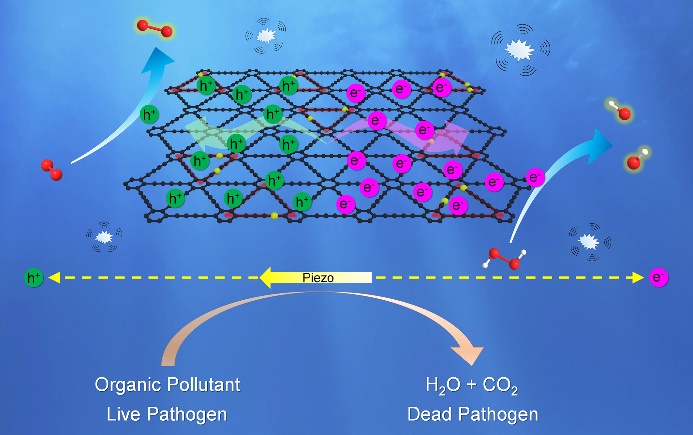 压电场增强石墨炔纳米酶性能。团队通过硫原子掺杂合成了含有丰富缺陷和空位的硫掺杂石墨炔纳米片,硫原子的引入使石墨炔在超声作用下能够显著提高其纳米酶性能。将此纳米酶应用于污水处理中,有较高的TOC去除效率,同时还具有良好的抗菌性能。该工作发表在Nano Today(2022, 43, 101429,影响因子: 20.722)上,KY开元博士生白强为该论文的共同一作,隋凝副教授、朱之灵副教授和王兆波教授为共同通讯作者,KY开元为唯一通讯单位。