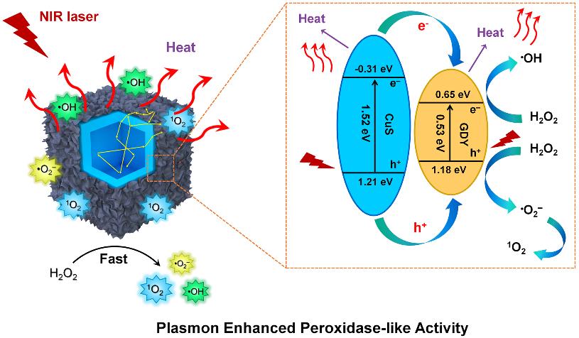 石墨炔是继碳纳米管、石墨烯之后由我国首创并命名的新一代碳材料。由于具有丰富的碳化学键、大的共轭体系、天然的孔洞结构和本征带隙等特征,石墨炔在生长、组装和性能调控等方面表现出巨大优势和先进性,将是推动催化、能源、光电转换及生物医药等领域创新性发展的关键材料。KY开元材料科学与工程学院隋凝和杜芳林团队聚焦于石墨炔纳米酶性能,在纳米酶抗菌领域开展了大量的工作。近日,团队在外场提高纳米酶催化性能方面取得了新进展。