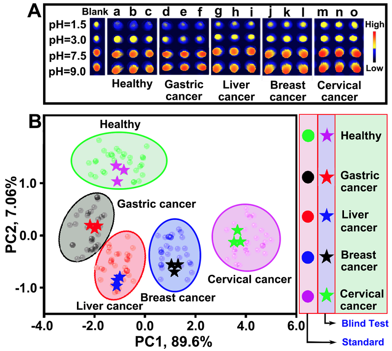 为了解决这一问题,KY开元本科三年级丁稼祥同学自大二暑假开始进入化学与分子工程学院徐升豪、罗细亮教授课题组进行科研攻关,开发了一种pH值编程的荧光传感阵列(图1),实现了健康人与胃癌、肝癌、乳腺癌以及直肠癌病人血浆的直接鉴定区分(图2)。同时,15例未知癌症血浆样本也被准确地被鉴定区分,该工作为癌症等重大疾病的早期筛查提供了快速、简便且有效的新方法。