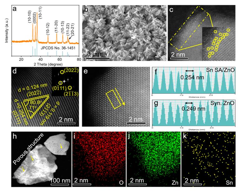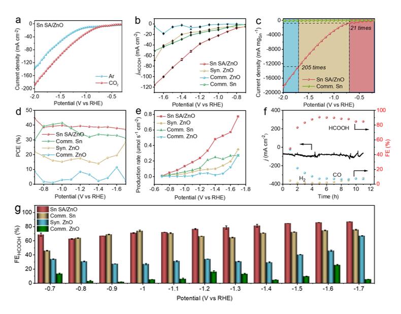 一般而言,商业ZnO对电还原CO2形成甲酸的选择性和活性较差,而Sn-基材料对CO2电还原为甲酸的选择性较高,但是金属Sn的价格比Zn高很多。本文设计制备了一种多孔ZnO纳米页负载单原子Sn催化剂(Sn SA/ZnO),由于Sn单原子的引入,导致ZnO基底产生拉伸应变。该催化剂在较宽的电压范围内(~ 1.0 V)展现出优于商业ZnO的电催化CO2还原为甲酸的活性和选择性,且质量活度比商业Sn粉提升了205倍。实验结合理论计算研究表明,Sn SA/ZnO材料表面暴露的双活性位点(Sn和O)可以有效捕获和活化CO2,而表面拉伸应变效应有利于增强*HCOO中间体的吸附,协同提升了电催化CO2还原为甲酸的活性和选择性。