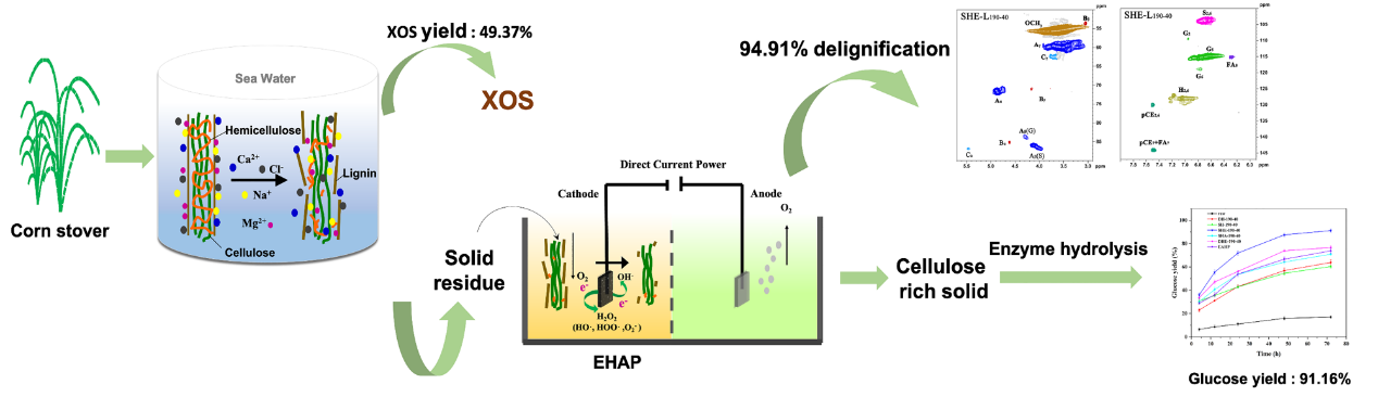 在此基础上,该团队提出了一种新颖的海水水热-电催化两步预处理技术,基于半纤维素优先策略实现了秸秆全组分的精准拆解与高效转化,同时制备低聚糖、可发酵性糖和小分子量木质素化合物,并揭示了主要组分的降解转化机制。相关研究成果以“Promising seawater hydrothermal combining electro-assisted pretreatment for corn stover valorization within a biorefinery concept”为题目,发表在生物质领域国际知名期刊Bioresource Technology (Bioresource Technol.2022, 351:127066. IF= 11.889,中科院一区TOP期刊)。论文第一作者为海洋学院硕士研究生吴越,通讯作者为吉喆副教授,KY开元集团官网为第一单位和唯一通讯单位。该项工作得到了国家自然科学基金、山东省重大创新工程的资助。