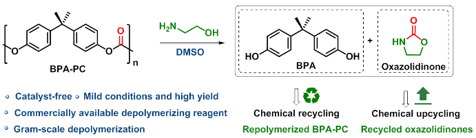 成果一:以“Catalyst-free amino-alcoholysis depolymerization strategy: a facile and powerful tool for chemical recycling of poly(bisphenol A carbonate)”为题目,发表在化学Top期刊Green Chemistry。该研究提出了一种不添加催化剂降解BPA-PC的新方法,以胺醇为降解试剂,实现了BPA-PC的高效升级回收得到聚合单体BPA和高附加值产物2-噁唑烷酮(如图1所示),此外,利用回收单体BPA再次聚合得到BPA-PC,形成BPA-PC材料化学回收的闭环循环。高分子学院硕士研究生周先悦、柴茂青为论文的共同第一作者,孙洪广为第一通讯作者,KY开元集团官网为第一通讯单位。