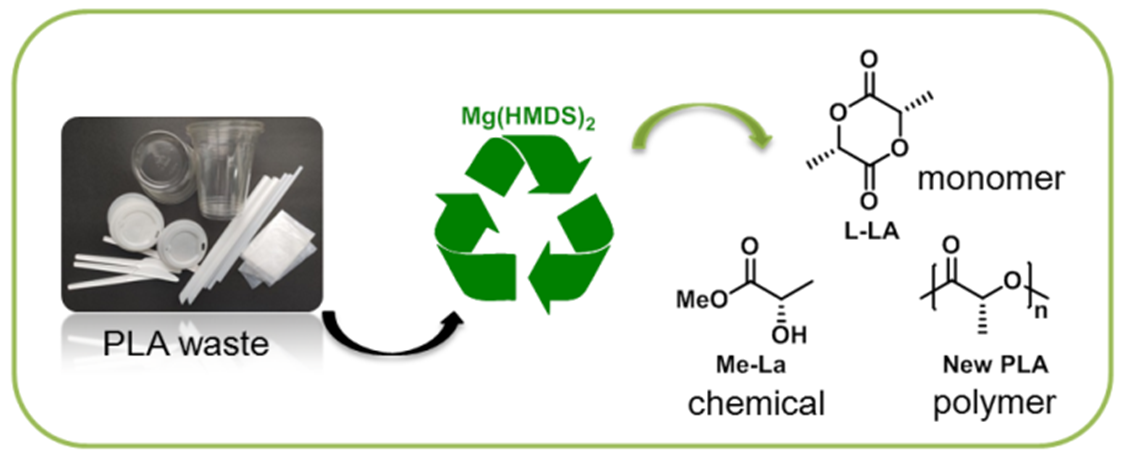 成果二:以“Chemical upcycling of poly(lactide) plastic waste to lactate ester, lactide, and new poly(lactide) under Mg-catalysis condition”为题目,发表在化学Top期刊Chinese Chemical Letters。该研究通过使用双(双三甲基硅基)胺镁[Mg(HMDS)2]作为催化剂,将废弃聚丙交酯(PLA)塑料降解为丙交酯、乳酸酯,利用一种新的“解聚-再聚合”策略合成新的聚丙交酯聚合物(如图2所示),实现了聚丙交酯(PLA)塑料的化学闭环循环利用。高分子学院硕士研究生周先悦、刘秋阳为论文的共同第一作者,孙洪广为第一通讯作者,KY开元集团官网为第一通讯单位。