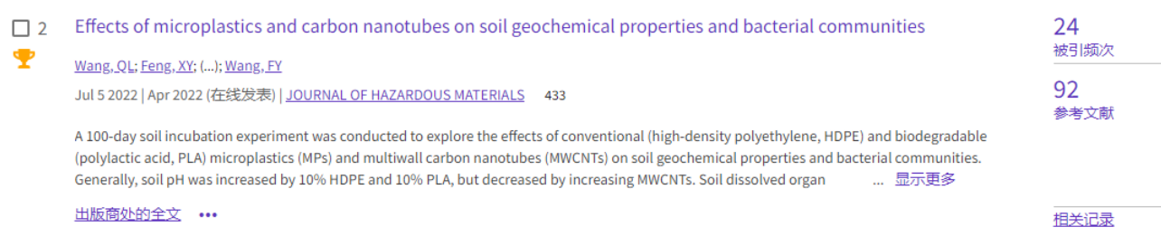 (2)论文2发表于环境类top期刊《Journal of Hazardous Materials》(https://doi.org/10.1016/j.jhazmat.2022.128826),累计被引24次。该文报道了传统难降解微塑料高密度聚乙烯(HDPE)、可生物降解微塑料聚乳酸(PLA)和碳纳米管对土壤养分、酶活性和细菌群落结构及多样性的效应,为认识微塑料和纳米颗粒的生态风险提供参考。