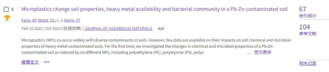 (3)论文3发表于环境类top期刊《Journal of Hazardous Materials》(https://doi.org/10.1016/j.jhazmat.2021.127364),累计被引67次。该文比较研究了3种传统难降解微塑料(PE、PS、PA)、3种可生物降解微塑料(PLA、PBS、PHB)对铅锌污染土壤中重金属有效性、土壤性质、酶活性和细菌群落结构及多样性的效应,结果证实微塑料和重金属共存可能会改变重金属的迁移能力及其潜在毒性,为认识微塑料和重金属的生态风险提供依据。